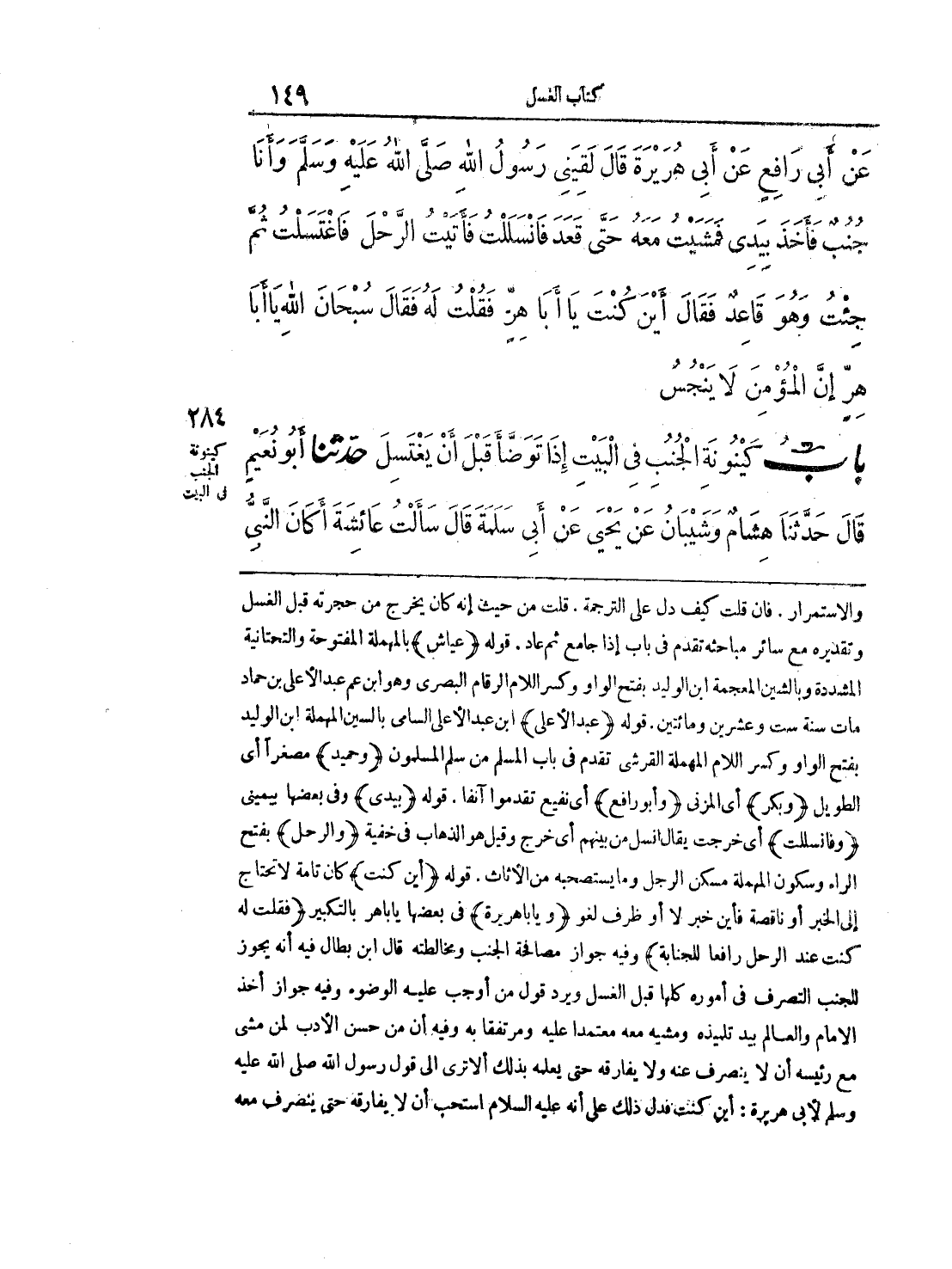 والاستمرار. فإن قلت كيف دل على الترجمةن قلت من حيث إنه كان يخرج من حجرته قبل الغسل وتقديره مع سائر مباحثه تقدم في باب إذا جامع ثم عاد، قوله (عياش) بالمهملة المفتوحة والتحتانية المشددة وبالشين المعجمة ابن الوليد بفتح الواو وكسر اللام الرقام البصري وهو ابن عم عبد الأعلى بن حامد مات سنة ست وعشرين ومائتين، قوله (عبد الأعلى) ابن عبد الأعلى السامي بالسين المهملة ابن الوليد بفتح الواو وكسر اللام المهملة القرشي تقدم في باب المسلم من سلم المسلمون (وحميد) مصغراً أي الطويل (وبكر) أي المزني (وأبو رافع) أي نفيع تقدموا آنفاً. قوله (بيدي) وفي بعضها بيميني (وفانسللت) أي خرجت يقال النسل من بينهم أي خرج وقيل هو الذهاب في خفية (والرجل) بفتح الراء وسكون المهملة مسكن الرجل وما يستصحبه من الأثاث. قوله (أين كنت) كان تامة لا تحتاج إلى الخبر أو ناقصة فأين خبر لا أو ظرف لغو (ويابا هريرة) في بعضها ياباهر بالتكبير (فقلت له كنت عند الرجل رافعاً للجنابة) وفيه جواز مصافحة الجنب ومخالطته قال ابنب اطل فيه أنه يجوز للجنب التصرف في أموره كلها قبل الغسل ويرد قول من أوجب عليه الوضوء وفيه جواز أخذ الإمام والعالم بيد تلميذه ومشيه معه معتمداً عليه ومرتفقاً به وفيه أن من حسن الأدب لمن مشى مع رئيسه أن لا ينصرف عنه ولا يفارقه حتى يعلمه بذلك ألا ترى إلى قول رسول الله صلى الله عليه وسلم لأبي هريرة: أين كنت فدل ذلك على أنه عليه السالم استحب أن لا يفارقه حتى ينصرف معه