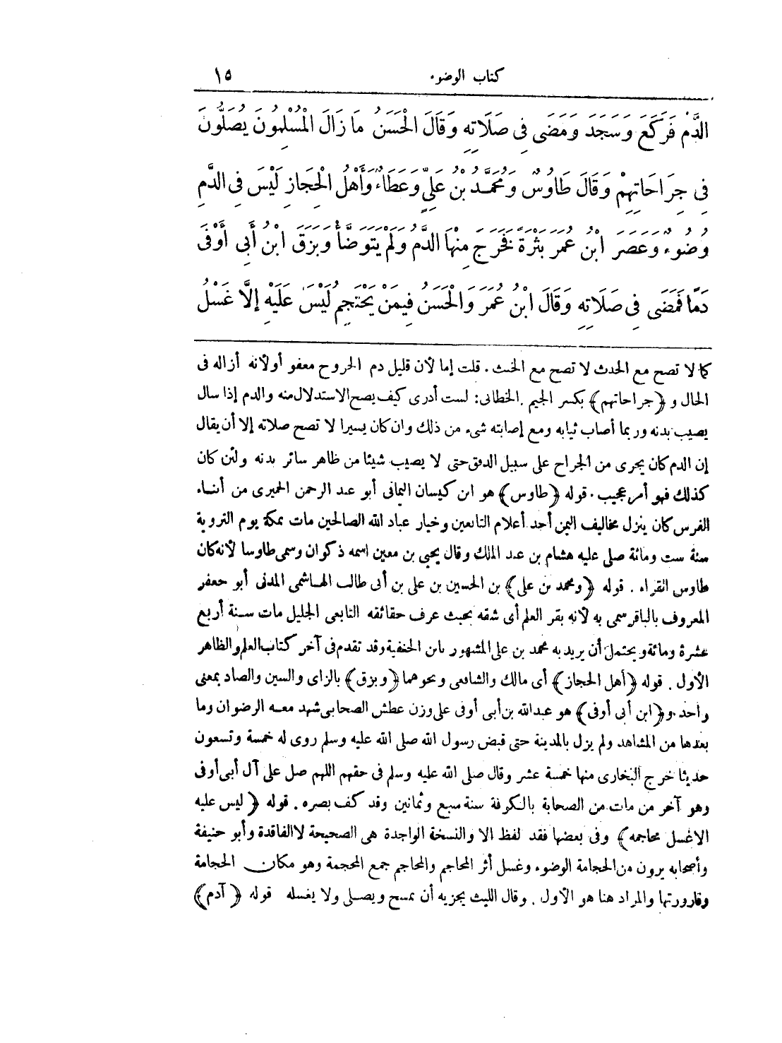 الدَّمُ فَرَكَعَ وَسَجَدَ، وَمَضَى فِى صَلاَتِهِ. وَقَالَ الْحَسَنُ مَا زَالَ الْمُسْلِمُونَ يُصَلُّونَ فِى جِرَاحَاتِهِمْ. وَقَالَ طَاوُسٌ وَمُحَمَّدُ بْنُ عَلِىٍّ وَعَطَاءٌ وَأَهْلُ الْحِجَازِ لَيْسَ فِى الدَّمِ وُضُوءٌ. وَعَصَرَ ابْنُ عُمَرَ بَثْرَةً فَخَرَجَ مِنْهَا الدَّمُ، وَلَمْ يَتَوَضَّا. وَبَزَقَ ابْنُ أَبِى أَوْفَى دَماً فَمَضَى فِى صَلاَتِهِ. وَقَالَ ابْنُ عُمَرَ وَالْحَسَنُ فِيمَنْ يَحْتَجِمُ لَيْسَ عَلَيْهِ إِلاَّ غَسْلُ