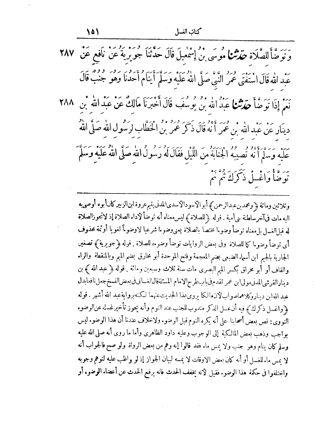 287 - حَدَّثَنَا مُوسَى بْنُ إِسْمَاعِيلَ قَالَ حَدَّثَنَا جُوَيْرِيَةُ عَنْ نَافِعٍ عَنْ عَبْدِ اللَّهِ قَالَ اسْتَفْتَى عُمَرُ النَّبِىَّ صَلَّى الله عليه وسلّم أَيَنَامُ أَحَدُنَا وَهْوَ جُنُبٌ قَالَ «نَعَمْ، إِذَا تَوَضَّأَ»