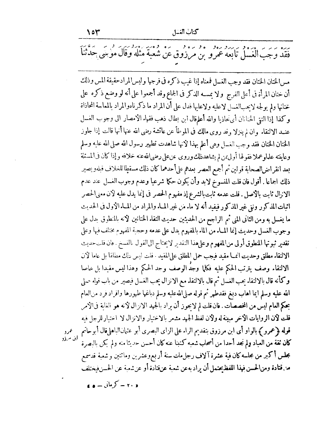 مس الختان الختان فقد وجب الغسل فمعناه إذا غيب ذكره في فرجها وليس المراد حقيقة المس وذلك أن ختان المرأة في أعلى الفرج ولا يمسه الذكر في الجماع وقد أجمعوا على أنه لو وضع ذكره على ختانها ولم يولجه لا يجب الغسل لا عليه ولا عليها فدل على أن المراد ما ذكرناه والمراد بالمماسة المحاذاة وكذا إذا التقى الختانان أي تحاذيا والله أعلم قال ابن بطال ذهب فقهاء الأمصار إلى وجوب الغسل عند الالتقاء وإن لم ينزلا وقد روى مالك في الموطأ عن عائشة رضي الله عنها أنها قالت إذا جاوز الختان الختان فقد وجب الغسل وهي أعلم بهذا لأنها شاهدت تطهير رسول الله صلى الله عليه وسلم وعاينته علماً وعملاً فقولها أولى ممن لم يشاهد ذلك وروى عن علي رضي الله عنه خلافه وإذا كان في المسئلة بعد انقراض الصحابة قولين ثم أجمع العصر بعدهم على أحدهما كان ذلك مسقطاً للخلاف قبله ويصير ذلك إجماعاً. أقول فإن قلت المنسوخ لابد وأن يكون حكماً شرعياً وعدم وجوب الغسل عند عدم الإنزال ثابت بالأصل. قلت عدمه ثابت بالشرع إذ مفهوم الحصر في إنما يدل عليه لأن معنى الحصر إثبات المذكور ونفي غير المذكور فيفيد أنه لا ماء من غير الماء والمراد من الماء الأول في الحديث ما يغسل به ومن الثاني المنى ثم الراجح من الحديثين حديث التقاء الختانين لأنه بالمنطوق يدل على وجوب الغسل وحديث إنما الماء من الماء بالمفهوم يدل على عدمه وحجية المفهوم مختلف فيها وعلى تقدير ثبوتها المنطوق أولى من المفهوم وعلى هذا التقدير لا يحتاج إلى القول بالنسخ. فإن قلت حديث الالتقاء مطلق وحديث إنما مقيد فيجب حمل المطلق على المقيد. قلت ليس ذلك مطلقاً بل عاماً لأن الالتقاء وصف يترتب الحكم عليه فكلما وجد الوصف وجد الحكم وهذا ليس مقيداً بل خاصاً وكأنه قال بالالتقاء يجب الغسل ثم قال بالالتقاء مع الإنزال يجب الغسل فيصير من باب قوله صلى الله عليه وسلم أيما أهاب دبغ فقد طهر ثم قوله صلى الله عليه وسلم دباغها طهورها وأفراد فرد من العام بحكم العام ليس من المخصصات. فإن قلت لم لا يجوز أن يراد بالجهد الإنزال لأنه هو الغاية في الأمر قلت لأن الروايات الأخر مبينة له ولان لفظ الجهد مشعر بالاختيار والإنزال لا اختيار للرجل فيه قوله (عمرو) بالواو أي ابن مرزوق بتقديم الراء على الزاي البصري أبو عثمان الباهلي قال أبو حاتم كان ثقة من العباد ولم نجد أحداً من أصحاب شعبه كتبنا عنه كان أحسن حديثاً منه ولم يكن بالبصرة مجلس أكبر من مجلسه كان فيه عشرة آلاف رجل مات سنة أربع وعشرين ومائتين وشعبة قد سمع من قتادة ومن الحسن فهذا اللفظ يحتمل أن يراد به عن شعبة عن قتادة أو عن شعبة عن الحسن فيختلف
