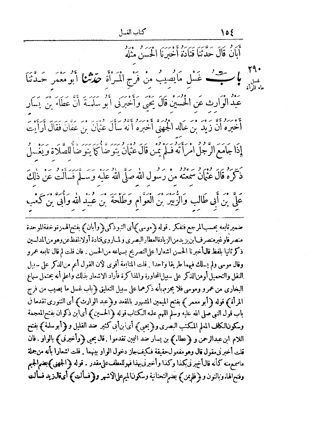 ضمير تابعه بحسب المرجع فتفكر. قوله (موسى) أي التبوذكي) وأبان) بفتح الهمزة وخفة الموحدة منصرفاً وغير منصرف ابن يزيد من الزيادة العطار البصري ولما روى قتادة أولا بلفظ عن وهو من المدلسين ذكر ثانياً بلفظ قال أخبرنا الحسن إشعاراً على التصريح بسماعه من الحسن. فإن قلت لم قال تابعه عمرو وقال موسى ولم ي يسلك فيهما طريقاً واحداً. قلت المتابعة أقوى لأن القول أعم من الذكر على سبيل النقل والتحميل أو من الذكر على سبيل المحاورة والمذاكرة فأراد الإشعار بذلك واعلم أنه يحتمل سماع البخاري من عمرو وموسى فلا يجزم بأنه ذكرهما على سبيل التعليق (باب غسل ما يصيب من فرج المرأة) قوله (أبو معمر) بفتح الميمين المشهور بالمقعد و (عبد الوارث) أي التنوري تقدماً في باب قول النبي صلى الله عليه وسلم اللهم علمه الكتاب قوله (الحسين) أي ابن ذكوان بفتح المعجم وسكون الكاف المعلم المكثب البصري و (يحيى) أي ابن أبي كثير ضد القليل و (أبو سلمة) بفتح اللام ابن عبد الرحمن و (عطاء) بن يسار ضد اليمين تقدموا. قال يحيى (وأخبرني) بالواو. فإن قلت أخبرني مقول قال وهو مفعول حقيقة فكيف جاز دخول الواو بينهما. قلت إشعاراً بأنه من جملة ما سمع منه كأنه قال أخبرني بكذا وكذا وأخبرني بهذا فهو للعطف على مقدر. قوله (الجهني) بضم الجيم وفتح الهاء وبالنون و (فلم يمن) بضم التحتانية وسكون الميم على الأشهر و (فسألت) أي قال زيد فسألت