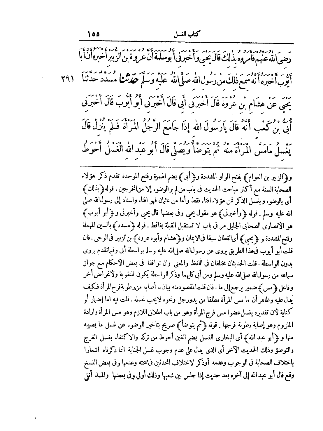 و (الزبير بن العوام) بفتح الواو المشددة و (أبي) بضم الهمزة وفتح الموحدة تقدم ذكر هؤلاء الصحابة الستة مع أكثر مباحث الحديث في باب من لم ير الوضوء إلا من المخرجين. قوله (بذلك) أي بالوضوء وبغسل الذكر فمن هؤلاء افتاء فقط وأما من عثمان فهو افتاء وإسناد إلى رسول الله صلى الله عليه وسلم، قوله (وأخبرني) هو مقول يحيى وفي بعضها قال يحيى وأخبرني و (أبو أيوب) هو الأنصاري الصحابي الجليل مر في باب لا تستقبل القبلة بغائط. قوله (مسدد) بالسين المهملة وفتح المشددة و (يحيى) أي القطان سبقاً في الإيمان و (هشام وأبو عروة) بن الزبير في الوحي. فإن قلت أبو أيوب في هذا الطريق يروي عن رسول الله صلى الله عليه وسلم بواسطة أبي وفيما تقدم يروي بدون الواسطة. قلت الحديثان مختلفان في اللفظ والمعنى وأن توافقا في بعض الأحكام مع جواز سماعه من رسول الله صلى الله عليه وسلم ومن أبي كليهما وذكر الواسطة يكون للتقوية ولأغراض أخر وفاعل (مس) ضمير يرجع إلى ما. فإن قلت المقصود منه بيان ما أصابه من رطوبة فرج المرأة فكيف يدل عليه وظاهر أن ما مس المرأة مطلقاً من يد ورجل ونحوه لا يجب غسله. قلت فيه إما إضمار أو كناية لأن تقديره يغسل عضوا مس فرج المرأة وهو من باب إطلاق اللازم وهو مس المرأة وإرادة الملزوم وهو إصابة رطوبة فرجها. قوله (ثم يتوضأ) صريح بتأخير الوضوء عن غسل ما يصيبه منها و (أبو عبد الله) أي البخاري الغسل بضم الغين أحوط من تركه والاكتفاء بغسل الفرج والتوضؤ وذلك الحديث الآخر أي الذي يدل على عدم وجوب غسل الجنابة إنما ذكرناه إشعاراً باختلاف الصحابة في الوجوب وعدمه أو ذكر لاختلاف المحدثين في صحته وعدمها وفي بعض النسخ وقع قال أبو عبد الله إلى آخره بعد حديث إذا جلس بين شعبها وذلك أولى وفي بعضها والماء أنقى