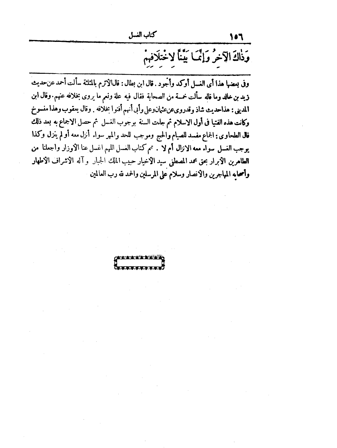 وفي بعضها هذا أي الغسل أوكد وأجود، قال ابن بطال: قال الأثرم بالمثلثة سألت أحمد عن حديث زيد بن خالد وما قاله سألت خمسة من الصحابة فقال فيه علة ونعم ما يروي بخلافه عنهم. وقال ابن المديني: هذا حديث شاذ وقد روى عن عثمان وعلي وأبي أنهم أفتوا بخلافه. وقال يعقوب وهذا منسوخ وكانت هذه الفتيا في أول الإسلام ثم جاءت السنة بوجوب الغسل ثم حصل الإجماع به بعد ذلك قال الطحاوي: الجماع مفسد للصيام والحج وموجب للحد والمهر سواء أنزل معه أو لم ينزل وكذا يوجب الغسل سواء معه الإنزال أم لا. ثم كتاب الغسل اللهم اغسل عنا الأوزار واجعلنا من الطاهرين الأبرار بحق محمد المصطفى سيد الأخيار حبيب الملك الجبار وآله الأشراف الأطهار وأصحابه المهاجرين والأنصار وسلام على المرسلين والحمد لله رب العالمين.