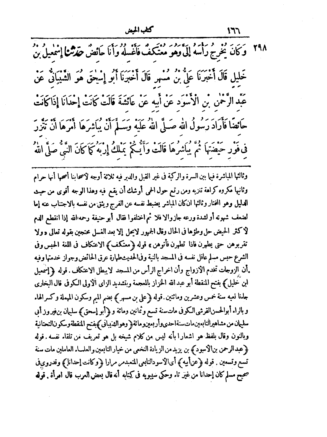 298 - حَدَّثَنَا إِسْمَاعِيلُ بْنُ خَلِيلٍ قَالَ أَخْبَرَنَا عَلِىُّ بْنُ مُسْهِرٍ قَالَ أَخْبَرَنَا أَبُو إِسْحَاقَ - هُوَ الشَّيْبَانِىُّ - عَنْ عَبْدِ الرَّحْمَنِ بْنِ الأَسْوَدِ عَنْ أَبِيهِ عَنْ عَائِشَةَ قَالَتْ كَانَتْ إِحْدَانَا إِذَا كَانَتْ حَائِضاً، فَأَرَادَ رَسُولُ اللَّهِ صَلَّى الله عليه وسلّم أَنْ يُبَاشِرَهَا، أَمَرَهَا أَنْ تَتَّزِرَ فِى فَوْرِ حَيْضَتِهَا ثُمَّ يُبَاشِرُهَا. قَالَتْ وَأَيُّكُمْ يَمْلِكُ إِرْبَهُ كَمَا كَانَ النَّبِىُّ صَلَّى الله