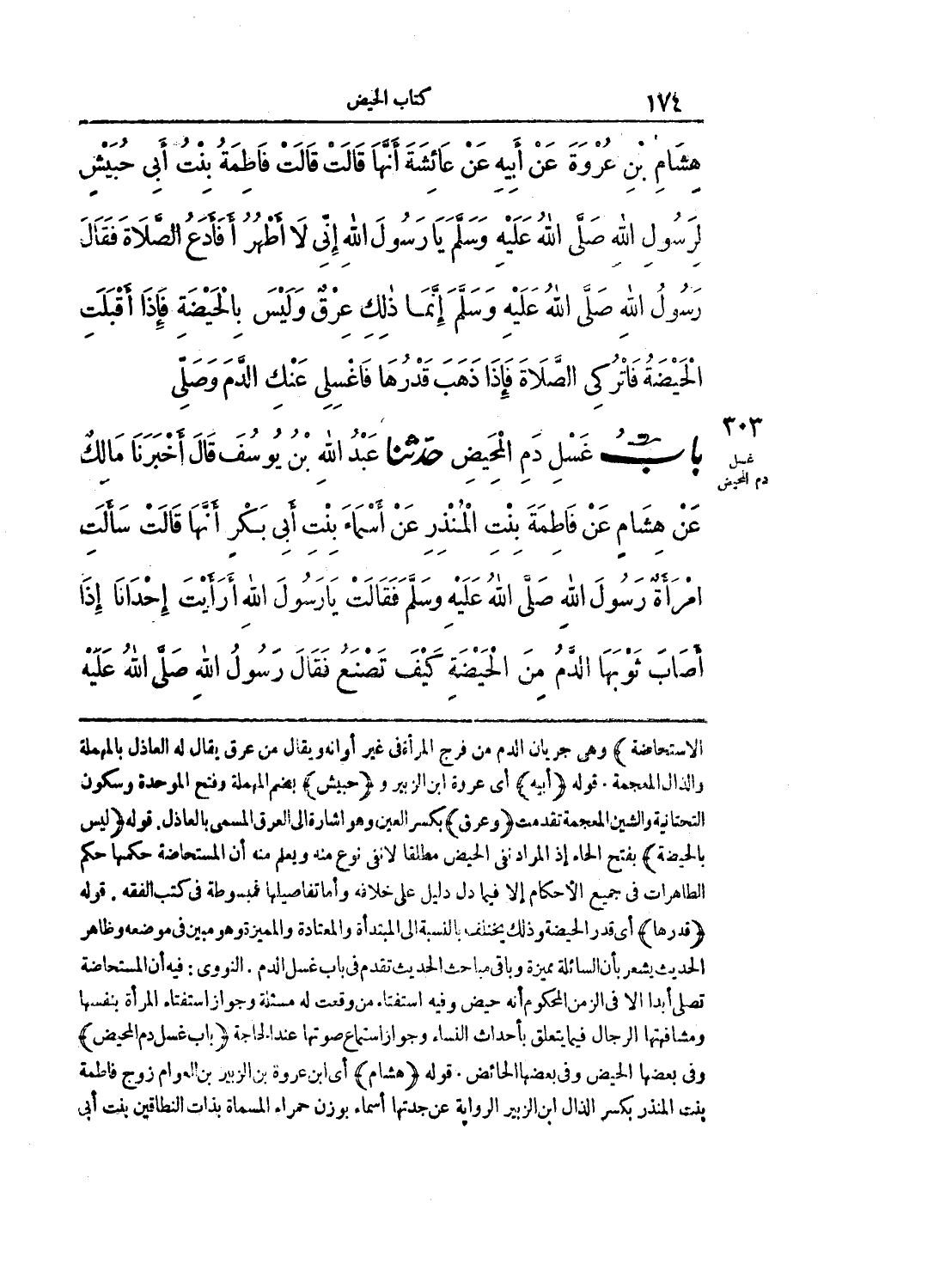الاستحاضة) وهي جريان الدم من فرج المرأة في غير أوانه ويقال من عرق يقال له العاذل بالمهملة والذال المعجمة. قوله (أبيه) أي عروة ابن الزبير و (حبيش) بضم المهملة وفتح الموحدة وسكون التحتانية والشين المعجمة تقدمت (وعرق) بكسر العين وهو إشارة إلى العرق المسمى بالعادل، قوله (ليس بالحيضة) بفتح الحاء إذ المراد نفي الحيض مطلقاً لا تفي نوع منه ويعلم منه أن المستحاضة حكمها حكم الطاهرات في جميع الأحكام إلا فيما دل دليل على خلافه وأما تفاصيلها فمبسوطة في كتب الفقه، قوله (قدرها) أي قدر الحيضة وذلك يختلف بالنسبة إلى المبتدأ والمعتادة والمميزة وهو مبين في موضعه وظاهر الحديث يشعر بأن السائلة مميزة وباقي مباحث الحديث تقدم في باب غسل الدم. النووي: فيه أن المستحاضة تصلي أبداً إلا في الزمن المحكوم أنه حيض وفيه استفتاء من وقعت له مسئلة وجواز استفتاء المرأة بنفسها ومشافهتها الرجال فيما يتعلق بأحداث النساء وجواز استماع صوتها عند الحاجة (باب غسل دم المحيض) وفي بعضها الحيض وفي بعضها الحائض. قوله (هشام) أي ابن عروة بن الزبير بن العوام زوج فاطمة بنت المنذر بكسر الذال ابن الزبير الرواية عن جدتها أسماء بوزن حمراء المسماة بذات النطاقين بنت أبي