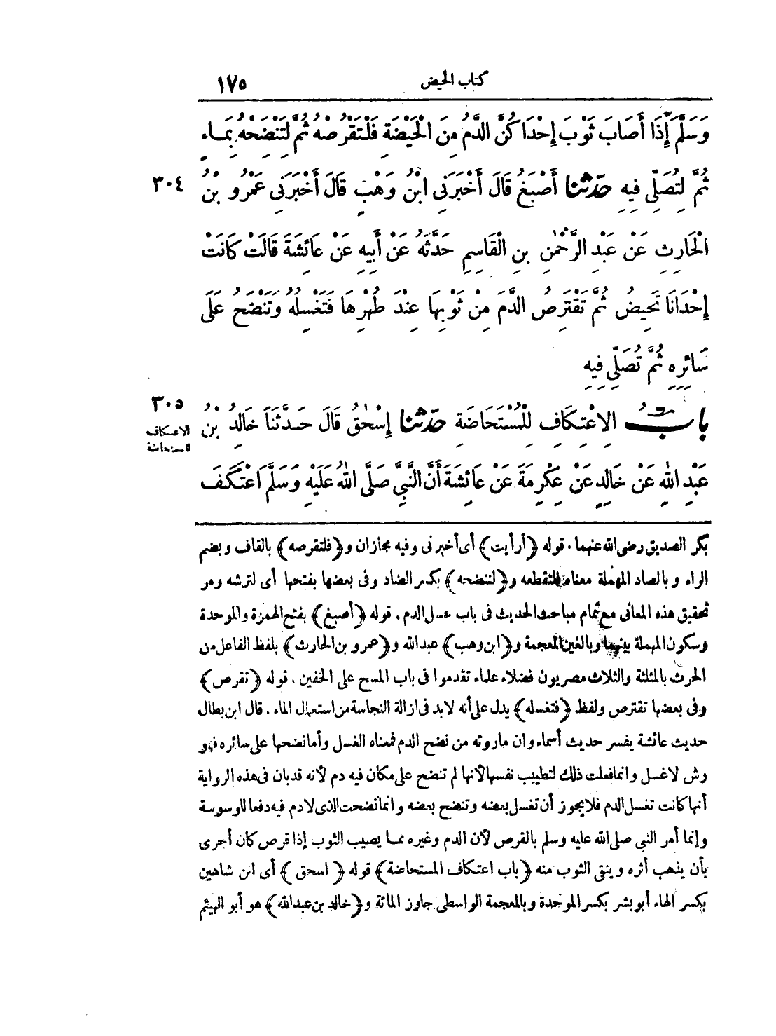 بكر الصديق رضي الله عنهما. قوله (أرأيت) أي أخبرني وفيه مجازان و (فلتقرصه) بالقاف وبضم الراء وبالصاد المهملة معناه المتقطعة و (لتنضحه) بكسر الضاد وفي بعضها بفتحها أي لترثه وهو تحقيق هذه المعاني مع تمام مباح والحديث في باب غسل الدم. قوله (أصبغ) بفتح الهمزة والموحدة وسكون المهملة بينهما وبالغين المعجمة و (ابن وهب) عبد الله و (عمرو بن الحارث) بلفظ الفاعل من الحرث بالمثلثة والثلاث مصريون فضلاء علماء تقدموا في باب المسح على الخفين، قوله (تقرص) وفي بعضها تقترص ولفظ (فتغسله) يدل على أنه لابد في إزالة النجاسة من استعمال الماء، قال ابن بطال حديث عائشة يفسر حديث أسماء وأن ما روته من نضح الدم فمعناه الغسل وأما نضحها على سائره فهو رش لا غسل وإنما فعلت ذلك لتطييب نفسها لأنها لم تنضح على مكان فيه دم لأنه قد بان في هذه الرواية أنها كانت تغسل الدم فلا يجوز أن تغسل بعضه وتنضح بعضه وإنما نضحت الذي لا دم فيه دفعاً لوسوسة وإنما أمر النبي صلى الله عليه وسلم بالقرص لأن الدم وغيره مما يصيب الثوب إذا قرض كان أجرى بأن يذهب أثره وينفي الثوب منه (باب اعتكاف المستحاضة) قوله (إسحق) أي ابن شاهين بكسر الهاء أبو بشر بكسر الموحدة وبالمعجمة الواسطي جاوز المائة و (خالد بن عبد الله) هو أبو الهيثم