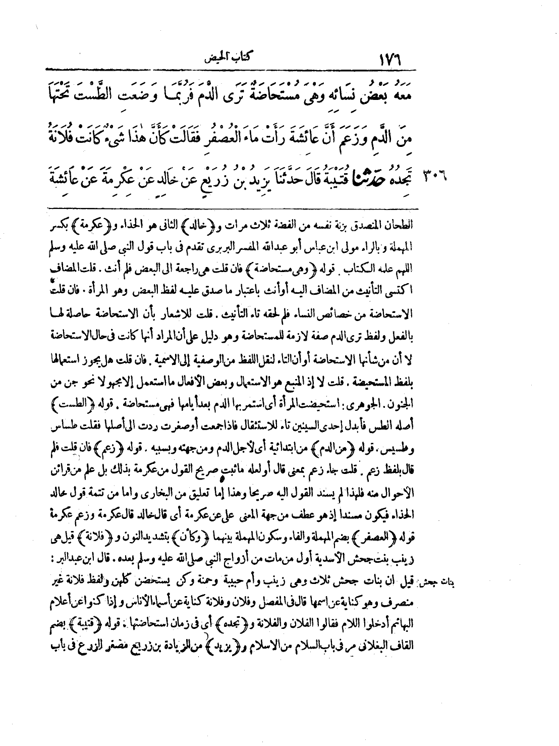 الطحان المتصدق بزنة نفسه من الفضة ثلاث مرات و (خالد) الثاني هو الحذاء و (عكرمة) بكسر المهملة وبالراء مولى ابن عباس أبو عبد الله المفسر البربري تقدم في باب قول النبي صلى الله عليه وسلم اللهم علمه الكتاب، قوله (وهي مستحاضة) فإن قلت هي راجعة إلى البعض فلم أنث. قلت المضاف اكتسى التأنيث من المضاف إليه أو أنث باعتبار ما صدق عليه لفظ البعض وهو المرأة. فإن قلت الاستحاضة من خصائص النساء فلم لحقه تاء التأنيث، قلت للإشعار بأن الاستحاضة حاصلة لها بالفعل ولفظ ترى الدم صفة لازمة للمستحاضة وهو دليل على أن المراد أنها كانت في حال الاستحاضة لا أن من شأنها الاستحاضة أو أن التاء لنقل اللفظ من الوصفية إلى الاسمية، فإن قلت هل يجوز استعمالها بلفظ المستحيضة، قلت لا إذ المنبع هو الاستعمال وبعض الأفعال ما استعمل إلا مجهولاً نحو جن من الجنون، الجوهري: استحيضت المرأة أي استمر بها الدم بعد أيامها فهي مستحاضة، قوله (الطست) أصله الطس فأبدل إحدى السينين تاء للاستثقال فإذا جمعت أو صغرت ردت إلى أصلها فقلت طاس وطسيس، قوله (من الدم) من ابتدائية أي لأجل الدم ومن جهته وبسببه، قوله (زعم) فإن قلت فلم قال بلفظ زعم، قلت جاء زعم بمعنى قال أو لعله ما ثبت صريح القول من عكرمة بذلك بل علم من قرائن الأحوال منه فلهذا لم يسند القول إليه صريحاً وهذا إما تعليق من البخاري وأما من تتمة قول خالد الحذاء فيكون مسنداً إذ هو عطف من جهة المعنى على عن عكرمة أي قال خالد قال عكرمة وزعم عكرمة قوله (العصفر) بضم المهملة والفاء وسكون المهملة بينهما (وكأن) بتشديد النون و (فلانة) قيل هي زينب بنت جحش الأسدية أول من مات من أزواج النبي صلى الله عليه وسلم بعده. قال ابن عبد البر: قيل أن بنات جحش ثلاث وهي زينب وأم حبيبة وحمتة وكن يستحضن كلهن ولفظ فلانة غير منصرف وهو كناية عن اسمها قال في المفصل وفلان وفلانة كناية عن أسماء الأناس وإذا كنوا عن أعلام البهائم أدخلوا اللام فقالوا الفلان والفلانة و (تجده) أي في زمان استحاضتها، قوله (قتيبة) بضم القاف البغلاني مر في باب السلام من الإسلام و (يزيد) من الزيادة بن زريع مصغر الزرع في باب