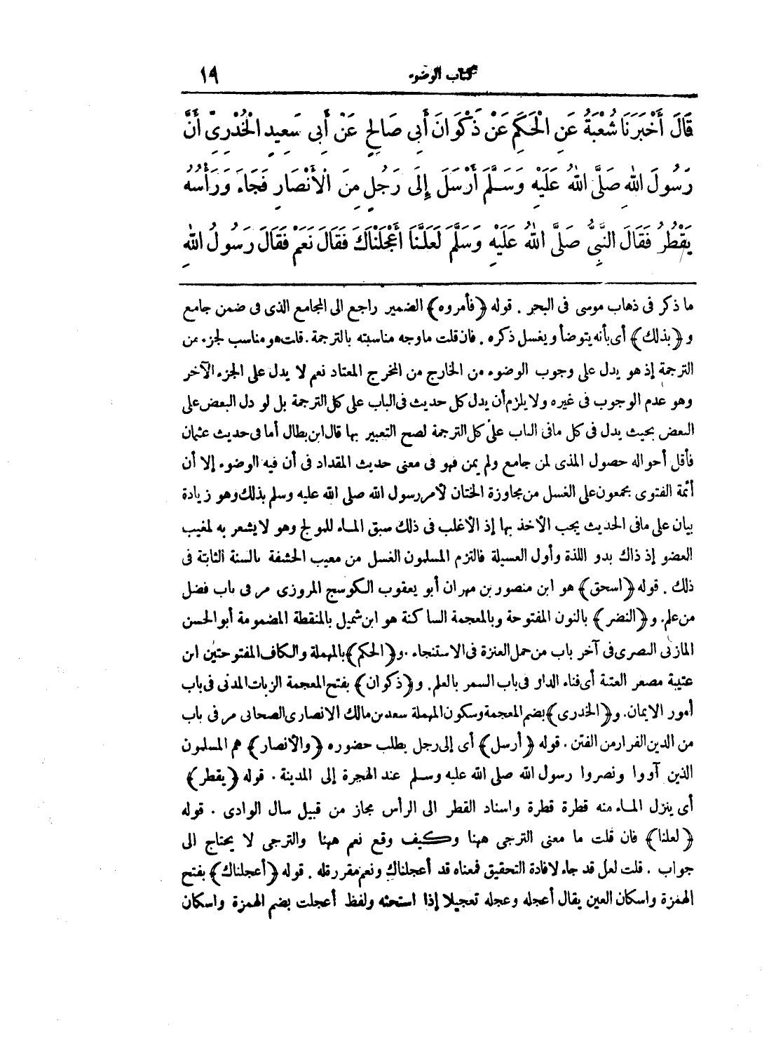 قَالَ أَخْبَرَنَا شُعْبَةُ عَنِ الْحَكَمِ عَنْ ذَكْوَانَ أَبِى صَالِحٍ عَنْ أَبِى سَعِيدٍ الْخُدْرِىِّ أَنَّ رَسُولَ اللَّهِ صَلَّى الله عليه وسلّم أَرْسَلَ إِلَى رَجُلٍ مِنَ الأَنْصَارِ فَجَاءَ وَرَاسُهُ يَقْطُرُ، فَقَالَ النَّبِىُّ صَلَّى الله عليه وسلّم «لَعَلَّنَا أَعْجَلْنَاكَ». فَقَالَ نَعَمْ. فَقَالَ رَسُولُ اللَّهِ