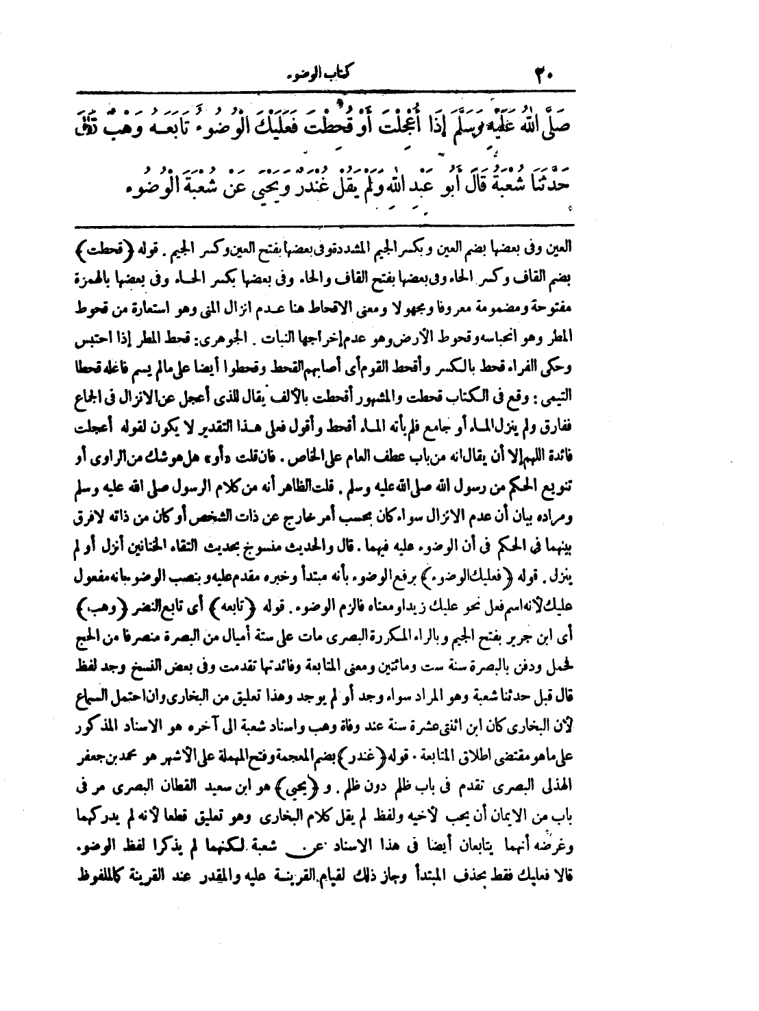 صَلَّى الله عليه وسلّم «إِذَا أُعْجِلْتَ أَوْ قُحِطْتَ، فَعَلَيْكَ الْوُضُوءُ». تَابَعَهُ وَهْبٌ قَالَ حَدَّثَنَا شُعْبَةُ. قَالَ أَبُو عَبْدِ اللَّهِ وَلَمْ يَقُلْ غُنْدَرٌ وَيَحْيَى عَنْ شُعْبَةَ الْوُضُوءُ