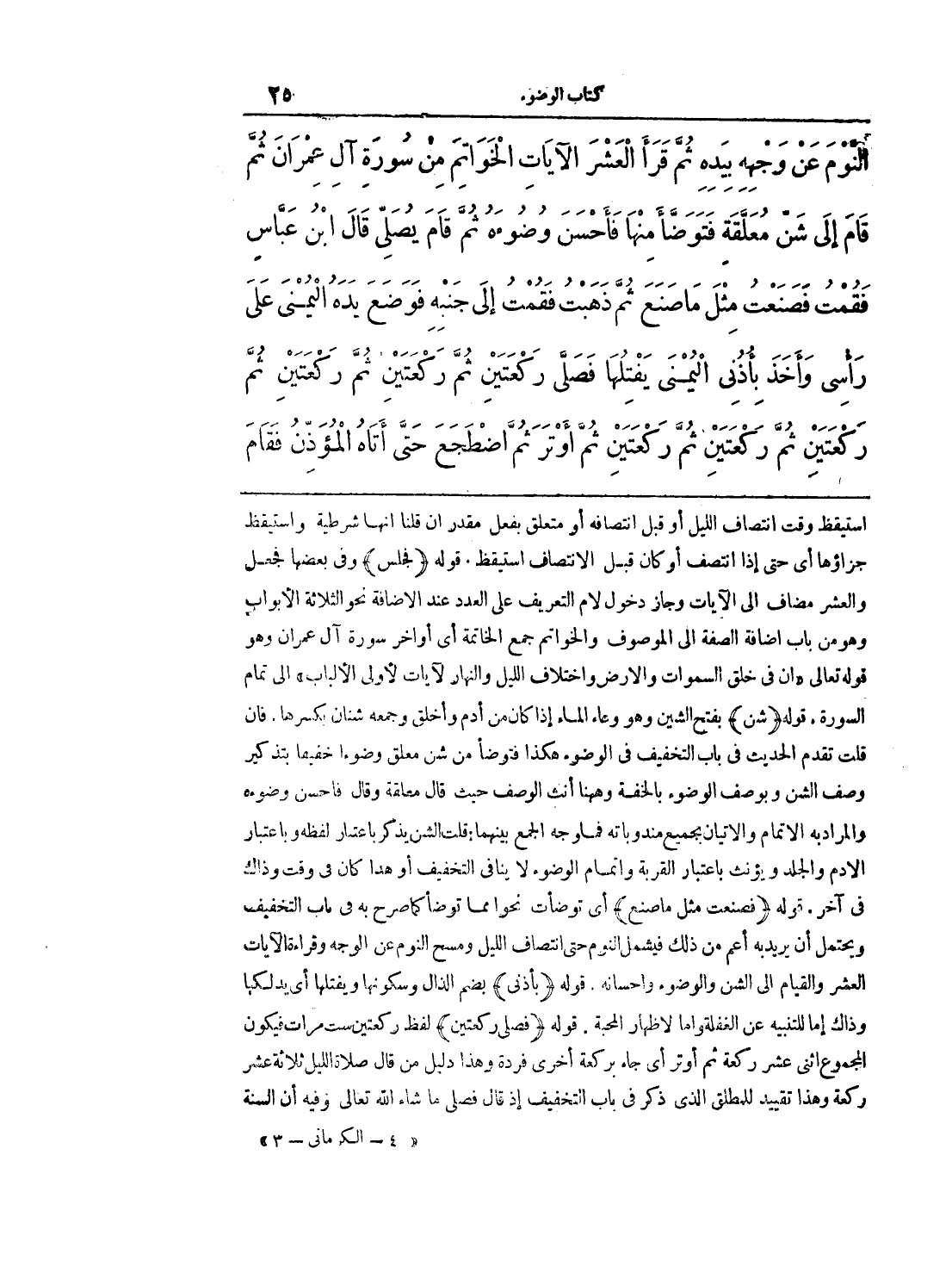 استيقظ وقت انتصاف الليل أو قبل انتصافه أو متعلق بفعل مقدر إن قلنا أنها شرطية واستيقظ جزاؤها أي حتى إذا انتصف أو كان قبل الانتصاف استيقظ. قوله (فجلس) وفي بعضها فجعل والعشر مضاف إلى الآيات وجاز دخول لام التعريف على العدد عند الإضافة نحو الثلاثة الأبواب وهو من باب إضافة الصفة إلى الموصوف والخواتم جمع الخاتمة أي أواخر سورة آل عمران وهو قوله تعالى (إن في خلق السموات والأرض واختلاف الليل والنهار لآياتٍ لأولي الألباب) إلى تمام السورة. قوله (شن) بفتح الشين وهو وعاء الماء إذا كان من أدم وأخلق وجمعه شنان بكسرها. فإن قلت تقدم الحديث في باب التخفيف في الوضوء هكذا فتوضأ من شن معلق وضوءاً خفيفاً بتذكير وصف الشن وبوصف الوضوء بالخفة وههنا أنث الوصف حيث قال معلقة وقال فأحسن وضوءه والمراد به الإتمام والإتيان بجميع مندوباته فما وجه الجمع بينهما: قلت الشن يذكر باعتبار لفظه وباعتبار الأدم والجلد ويؤنث باعتبار القربة وإتمام الوضوء لا ينافي التخفيف أو هذا كان في وقت وذاك في آخر. قوله (فصنعت مثل ما صنع) أي توضأت نحواً مما توضأ كما صرح به في باب التخفيف ويحتمل أن يريد به أعم من ذلك فيشمل النوم حتى انتصاف الليل ومسح النوم عن الوجه وقراءة الآيات العشر والقيام إلى الشن والوضوء وإحسانه. قوله (بأذني) بضم الذال وسكونها ويقتلها أي يدلكها وذاك إما للتنبيه عن الغفلة وإما لإظهار المحبة. قوله (فصلى ركعتين) لفظ ركعتين ست مرات فيكون المجموع اثنى عشر ركعة ثم أوتر أي جاء بركعة أخرى فردة وهذا دليل من قال صلاة الليل ثلاثة عشر ركعة وهذا تقييد للمطلق الذي ذكر في باب التخفيف إذ قال فصلى ما شاء الله تعالى وفيه أن السنة