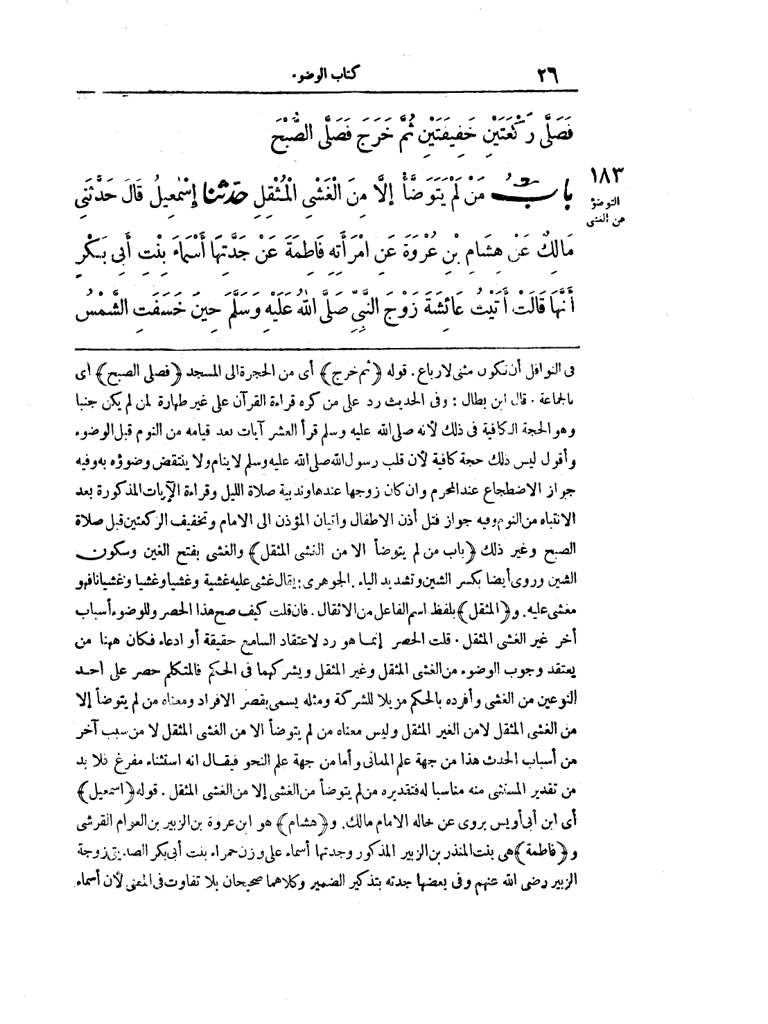 في النوافل أن تكون مثنى لا رباع. قوله (ثم خرج) أي من الحجرة إلى المسجد (فصلى الصبح) أي بالجماعة. قال ابن بطال: وفي الحديث رد على من كره قراءة القرآن على غير طهارة لمن لم يكن جنباً وهو الحجة الكافية في ذلك لأنه صَلَّى الله عليه وسلّم قرأ العشر آيات بعد قيامه من النوم قبل الوضوء وأقول ليس ذلك حجة كافية لأن قلب رسول الله صَلَّى الله عليه وسلّم لا ينام ولا ينتفض وضوؤه به وفيه جواز الاضطجاع عند المحرم وإن كان زوجها عندها وندبية صلاة الليل وقراءة الآيات المذكورة بعد الانتباه من النوم وفيه جواز فتل أذن الأطفال وإتيان المؤذن إلى الإمام وتخفيف الركعتين قبل صلاة الصبح وغير ذلك (باب من لم يتوضأ إلا من الغشى المثقل) والغشى بفتح الغين وسكون الشين وروي أيضاً بكسر الشين وتشديد الياء. الجوهري: يقال غشي عليه غشية وغشيا وغشياً وغشياناً فهو مغشى عليه. و (المثقل) بلفظ اسم الفاعل من الأثقال. فإن قلت كيف صح هذا الحصر وللوضوء أسباب أخر غير الغشي المثقل. قلت الحصر إنما هو رد لاعتقاد السامع حقيقة أو ادعاء فكان ههنا من يعتقد وجوب الوضوء من الغشي المثقل وغير المثقل ويشركهما في الحكم فالمتكلم حصر على أحد النوعين من الغشي وأفرده بالحكم مزيلاً للشركة ومثله يسمى بقصر الأفراد ومعناه من لم يتوضأ إلا من الغشي المثقل لا من الغير المثقل وليس معناه من لم يتوضأ إلا من الغشي المثقل لا من سبب آخر من أسباب الحدث هذا من جهة علم المعاني وأما من جهة علم النحو فيقال أنه استثناء مفرغ فلا بدمن تقدير المستثنى منه مناسباً له فتقديره من لم يتوضأ من الغشي إلا من الغش المثقل. قوله (إسمعيل) أي ابن أبي أويس يروى عن خاله الإمام مالك. و (هشام) هو ابن عروة بن الزبير بن العوام القرشي و (فاطمة) هي بنت المنذر بن الزبير المذكور وجدتها أسماء على وزن حمراء بنت أبي بكر الصديق زوجة الزبير رضي الله عنهم وفي بعضها جدته بتذكير الضمير وكلاهما صحيحان بلا تفاوت في المعنى لأن أسماء