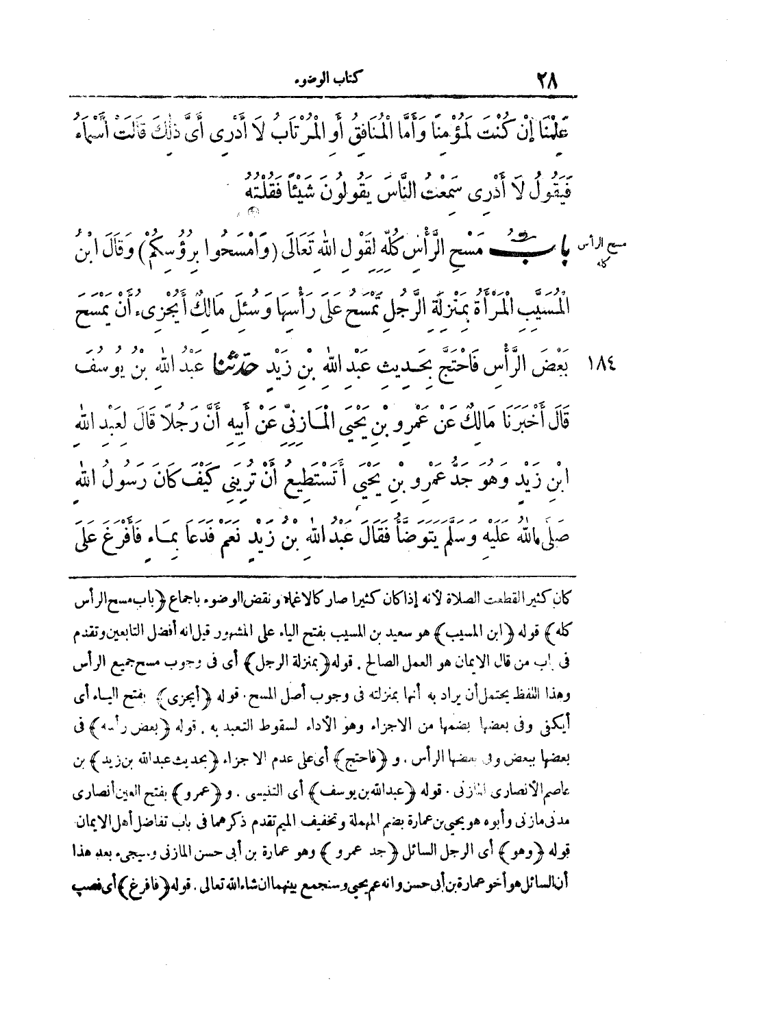كان كثيراً لقطعت الصلاة لأنه إذا كان كثيراً صار كالإغماء ونقض الوضوء بإجماع (باب مسح الرأس كله) قوله (ابن المسيب) هو سعيد بن المسيب بفتح الياء على المشهور قيل أنه أفضل التابعين وتقدم في باب من قال الإيمان هو العمل الصالح. قوله (بمنزلة الرجل) أي في وجوب مسح جميع الرأس وهذا اللفظ يحتمل أن يراد به أنها بمنزلته في وجوب أصل المسح. قوله (أيجزى) بفتح الياء أي أيكفي وفي بعضها بضمها من الأجزاء وهو الأداء لسقوط التعبد به. قوله (بعض رأسه) في بعضها ببعض وفي بعضها الرأس. و (فاحتج) أي على عدم الأجزاء (بحديث عبد الله بن زيد) بن عاصم الأنصاري المازني. قوله (عبد الله بن يوسف) أي التنيسي. و (عمرو) بفتح العين أنصاري مدني مازني وأبوه هو يحيى بن عمارة بضم المهملة وتخفيف الميم تقدم ذكرهما في باب تفاضل أهل الإيمان قوله (وهو) أي الرجل السائل (جد عمرو) وهو عمارة بن أبي حسن المازني وسيجئ بعد هذا أن السائل هو أخو عمارة بن أبي حسن وأنه عم يحيى وسنجمع بينهما إن شاء الله تعالى. قوله (فافرغ) أي نصب
