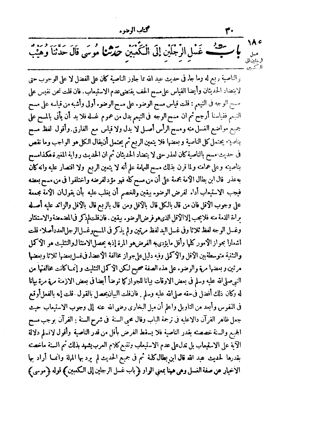 والناصية ربع له وما جاء في حديث عبد الله مما جاوز الناصية كان على الفضل لا على الوجوب حتى لا يتضاد الحديثان وأيضاً القياس على مسح الخف يقتضي عدم الاستيعاب. فإن قلت نحن نقيس على مسح الوجه في التيمم: قلت قياس مسح الوضوء على مسح الوضوء أولى وأشبه من قياسه على مسح التيمم فقياسنا أرجح ثم أن مسح الوجه في التيمم بدل من عموم غ سله فلا بد أن يأتي بالمسح على جميع مواضع الغسل منه ومسح الرأس أصل لا بدل من عموم غسله فلا بد أن يأتي بالمسح على جميع مواضع الغسل منه ومسح الرأس أصل لا بدل ولا قياس مع الفارق. وأقول لفظ مسح بناصيته يحتمل كل الناصية وبعضها فلا يتعين الربع ثم يحتمل أن يقال الكل هو الواجب وما نقص في حديث مسح بالناصية كان لعذر حتى لا يتضاد الحديثان ثم إن الحديث رواية المغيرة هكذا مسح بناصيته وعلى عمامته ولما قرن بذلك مسح العمامة علم أنه لا يتعين الربع ولا اقتصار عليه وأنه كان به عذر قال ابن بطال الأمة مجمعة على أن من مسح كله فهو مؤد لفرضه واختلفوا في من مسح بعضه فيجب الاستيعاب أداء لفرض الوضوء بيقين وللخصم أن يغلب عليه بأن يقول أن الأمة مجمعة على وجوب الأقل فإن من قال بالكل قال بالأقل ومن قال بالربع قال بالأقل والزائد عليه أصله براءة الذمة منه فلا يجب غلا الأقل الذي هو فرض الوضوء بيقين. فإن قلت لم ذكر في المضمضة والاستنثار وغسل الوجه لفظ ثلاثاً وفي غسل اليد لفظ مرتين ولم يذكر في المسح وغسل الرجل العدد أصلاً قلت إشعاراً بجواز الأمور كلها وأقل ما يؤدي به الفرض هو المرة إذ به يحصل الامتثال والتثليث هو الأكمل والتثنية متوسطة بين الأقل والأكمل وفيه دليل على جواز مخالفة الأعضاء في غسل بعضها ثلاثاً وبعضها مرتين وبعضها مرة والوضوء على هذه الصفة صحيح لكن الأكمل التثليث وإنما كانت مخالفتها من النبي صَلَّى الله عليه وسلّم في بعض الأوقات بياناً للجواز كما توضأ أيضاً في بعض الأزمنة مرة مرة بياناً له وكان ذلك أفضل في حقه صَلَّى الله عليه وسلّم. فإن قلت البيان يحصل بالقول قلت إنه بالفعل أوقع في النفوس وأبعد من التأويل واعلم أن ميل البخاري رضي الله عنه إلى وجوب الاستيعاب حيث جعل ظاهر القرآن دالاً عليه في ترجمة الباب وقال محيي السنة في شرح السنة: القرآن يوجب مسح الجميع والسنة خصصته بقدر الناصية فلا يسقط الفرض بأقل من قدر الناصية وأقول لا نسلم دلالة الآية على الاستيعاب بل تدل على عدم الاستيعاب وتتبع كلام العرب يشهد بذلك ثم السنة ما خصته بقدرها لحديث عبد الله قال ابن بطال كلمة ثم في جميع الحديث لم يرد بها المهلة وإنما أراد بها الإخبار عن صفة الغسل وهي ههنا بمعنى الواو (باب غسل الرجلين إلى الكعبين) قوله (موسى)