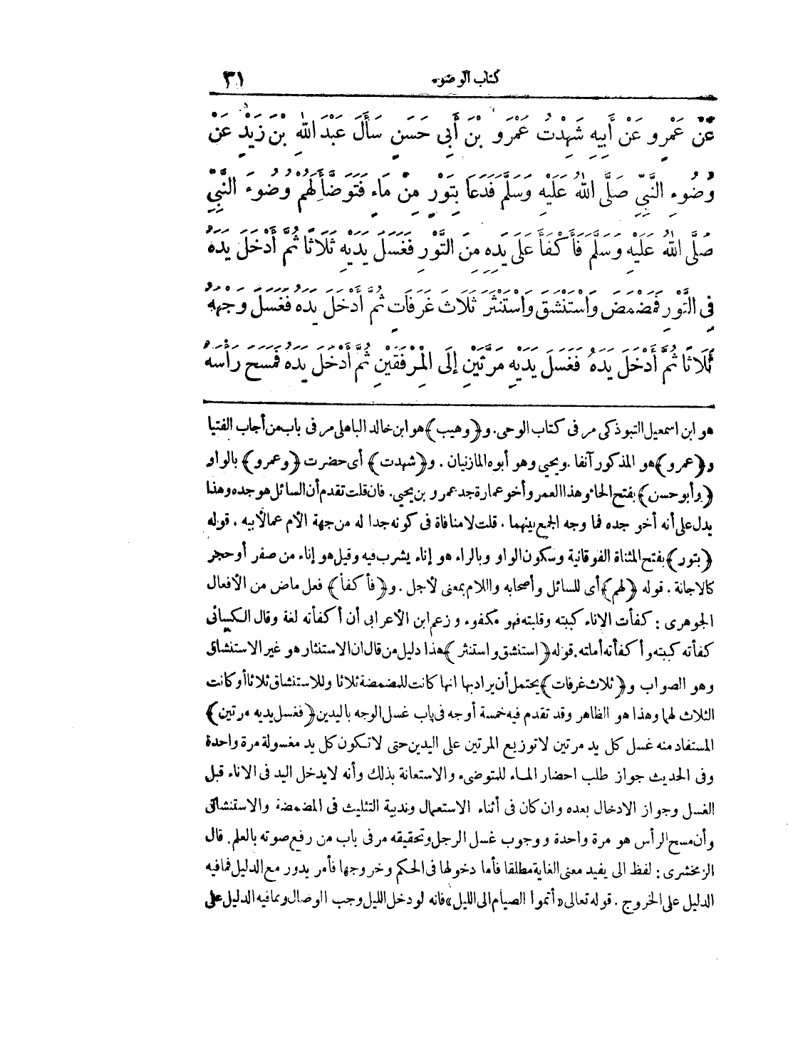 عَنْ عَمْرٍو عَنْ أَبِيهِ شَهِدْتُ عَمْرَو بْنَ أَبِى حَسَنٍ سَأَلَ عَبْدَ اللَّهِ بْنَ زَيْدٍ عَنْ وُضُوءِ النَّبِىِّ صَلَّى الله عليه وسلّم فَدَعَا بِتَوْرٍ مِنْ مَاءٍ، فَتَوَضَّأَ لَهُمْ وُضُوءَ النَّبِىِّ صَلَّى الله عليه وسلّم فَأَكْفَأَ عَلَى يَدِهِ مِنَ التَّوْرِ، فَغَسَلَ يَدَيْهِ ثَلاَثاً، ثُمَّ أَدْخَلَ يَدَهُ فِى التَّوْرِ، فَمَضْمَضَ وَاسْتَنْشَقَ وَاسْتَنْثَرَ ثَلاَثَ غَرَفَاتٍ، ثُمَّ أَدْخَلَ يَدَهُ فَغَسَلَ وَجْهَهُ ثَلاَثاً، ثُمَّ أَدْخَلَ يَدَهُ فَغَسَلَ يَدَيْهِ مَرَّتَيْنِ إِلَى الْمِرْفَقَيْنِ مَرَّتَيْنِ، ثُمَّ أَدْخَلَ يَدَهُ فَمَسَحَ رَاسَهُ