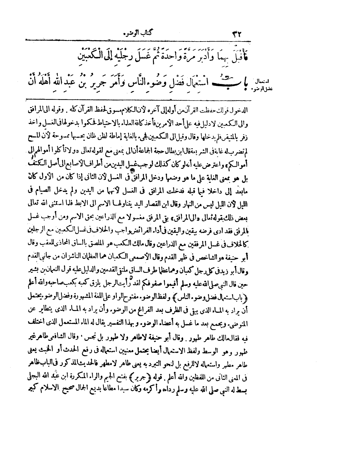 الدخول قولك حفظت القرآن من أوله إلى آخره لأن الكلام مسوق لحفظ القرآن كله. وقوله إلى المرافق وإلى الكعبين لا دليل فيه على أحد الأمرين فأخذ كافة العلماء بالاحتياط فحكموا بدخولها في الغسل وأخذ زفر بالمتيقن فلم يدخلها وقال وقيل إلى الكعبين فجئ بالغاية إماطة لظن ظان يحسبها ممسوحة لأن المسح لم تضرب له غاية في الشريعة قال ابن بطال حجة الجماعة أن إلى بمعنى مع لقوله تعالى: (ولا تأكلوا أموالهم إلى أموالكم) واعترض عليه أنه لو كان كذلك لوجب غسل اليدين من أطراف الأصابع إلى أصل الكتف بل هو بمعنى الغاية على ما هو وضعها ودخل المرافق في الغسل لأن الثاني إذا كان من الأول كان ما بعد إلى داخلاً فيما قبله فدخلت المرافق في الغسل لأنهما من اليدين ولم يدخل الصيام في الليل لأن الليل ليس من النهار وقال ابن القصار اليد يتناولها الاسم إلى الإبط فلما استثنى الله تعالى بعض ذلك بقوله تعالى (إلى المرافق) بقي المرفق مغسولاً مع الذراعين بحق الاسم ومن أوجب غسل المرفق فقد أدى فرضه بيقين واليقين في أداء الفرائض واجب والخلاف في غسل الكعبين مع الرجلين كالخلاف في غسل المرفقين مع الذراعين وقال مالك الكعب هو الملصق بالساق المحاذي للعقب وقال أبو حنيفة هو الشاخص في ظهر القدم وقال الأصمعي الكعبان هما العظمان الناشزان من جانبي القدم وقال أبو زيد في كل رجل كعبان وهما عظما طرف الساق ملتقى القدمين والدليل عليه قول النعمان بن بشير حين قال النبي صَلَّى الله عليه وسلّم أقيموا صفوفكم لقد رأيت الرجل يلزق كعبه بكعب صاحبه والله أعلم. (باب استعمال فضل وضوء الناس) ولفظ الوضوء مفتوح الواو على اللغة المشهورة وفضل الوضوء يحتمل أن يراد به الماء الذي يبقى في الظرف بعد الفراغ من الوضوء وأن يراد به الماء الذي يتطاير عن المتوضئ ويجمع بعد ما غسل به أعضاء الوضوء وبهذا التفسير يقال له الماء المستعمل الذي اختلف فيه فقال مالك طاهر طهور. وقال أبو حنيفة لا طاهر ولا طهور بل نجس. وقال الشافعي طاهر غير طهور وهو الوسط ولفظ الاستعمال أيضاً يحتمل معنيين استعماله في رفع الحدث أو الخبث يعني طاهر مطهر واستعماله لا للرفع بل لنحو التبرد به يعني طاهر لا مطهر فالحديث المذكور في الباب ظاهر في المعنى الثاني من اللفظين والله أعلم. قوله (جرير) بفتح الجيم والراء المكررة ابن عبد الله البجلي بسط له النبي صَلَّى الله عليه وسلّم رداءه وأكرمه وكان سيداً مطاعاً بديع الجمال صحيح الإسلام كبير