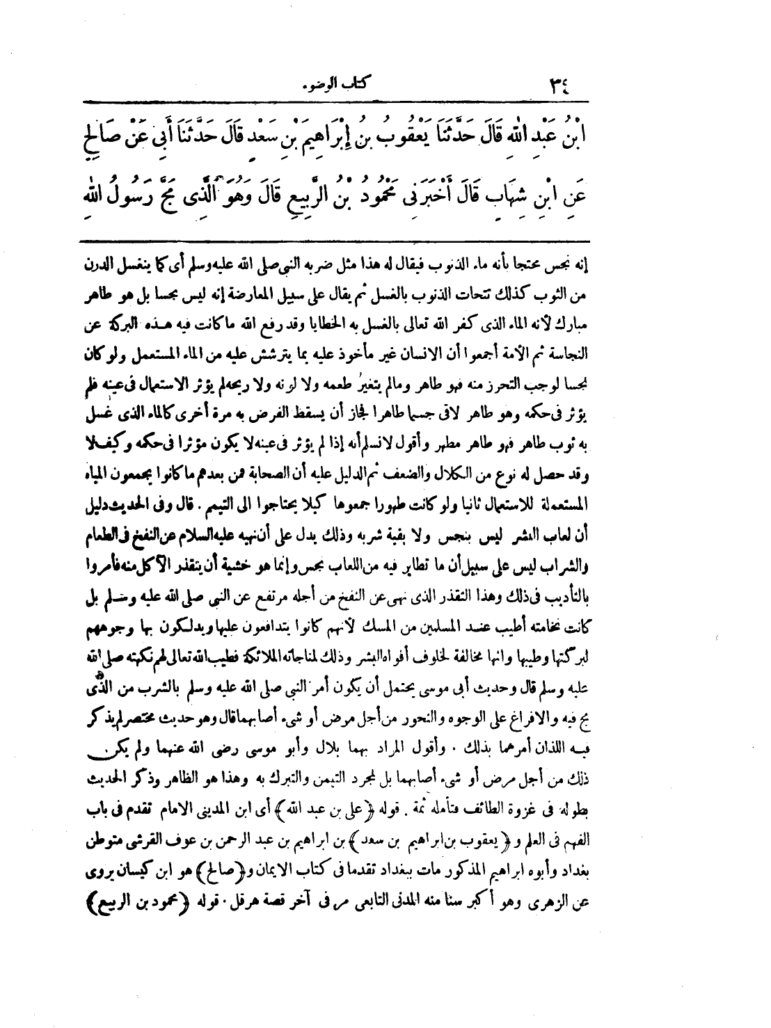 إنه نجس محتجاً بأنه ماء الذنوب فيقال له هذا مثل ضربه النبي صَلَّى الله عليه وسلّم أي كما ينغسل الدرن من الثوب كذلك تتحات الذنوب بالغسل ثم يقال على سبيل المعارضة إنه ليس بحساً بل هو طاهر مبارك لأنه الماء الذي كفر الله تعالى بالغسل به الخطايا وقد رفع الله ما كانت فهي هذه البركة عن النجاسة ثم الأمة أجمعوا أن الإنسان غير مأخوذ عليه بما يترشش عليه من الماء المستعمل ولو كان نجساً لوجب التحرز منه فهو طاهر وما لم يتغير طعمه ولا لونه ولا ريحه لم يؤثر الاستعمال في عينه فلم يؤثر في حكمه وهو طاهر لاقى جسماً طاهراً فجاز أن يسقط الفرض به مرة أخرى كالماء الذي غسل به ثوب طاهر فهو طاهر مطهر وأقول لا نسلم أنه إذا لم يؤثر في عينه لا يكون مؤثراً في حكمه وكيف لا وقد حصل له نوع من الكلال والضعف ثم الدليل عليه أن الصحابة فمن بعدهم ما كانوا يجمعون المياه المستعملة للاستعمال ثانياً ولو كانت طهوراً جمعوها كيلا يحتاجوا إلى التيمم. قال وفي الحديث دليل أن لعاب البشر لي بنجس ولا بقية شربه وذلك يدل على أن نهيه عليه السلام عن النفخ في الطعام والشراب ليس على سبيل أن ما تطاير فيه من اللعاب نجس وإنما هو خشية أن يتقذر الأكل منه فأمروا بالتأديب في ذلك وهذا التقذر الذي نهى عن النفخ من أجله مرتفع عن النبي صَلَّى الله عليه وسلّم بل كانت نخامته أطيب عند المسلمين من المسك لأنهم كانوا يتدافعون عليها ويدلكون بها وجوههم لبركتها وطيبها وأنها مخالفة لخلوف أفواه البشر وذلك لمناجاته الملائكة فطيب الله تعالى لهم نكهته صَلَّى الله عليه وسلّم قال وحديث أبي موسى يحتمل أن يكون أمر النبي صَلَّى الله عليه وسلّم بالشرب من الذي مج فيه والإفراغ على الوجوه والنحور من أجل مرض أو شئ أصابهما قال وهو حديث مختصر لم يذكر فيه اللذان أمرهما بذلك. وأقول المراد بهما بلال وأبو موسى رضي الله عنهما ولم يكن ذلك من أجل مرض أو شئ أصابهما بل لمجرد التيمن والتبرك به وهذا هو الظاهر وذكر الحديث بطوله في غزوة الطائف فتأمله ثمة. قوله (على بن عبد الله) أي ابن المديني الإمام تقدم في باب الفهم في العلم و (يعقوب بن إبراهيم بن سعد) بن إبراهيم بن عبد الرحمن بن عوف القرشي متوسطن بغداد وأبوه إبراهيم المذكور مات ببغداد تقدماً في كتاب الإيمان و (صالح) هو ابن كيسان يروى عن الزهري وهو أكبر سناً منه المدني التابعي مر في آخر قصة هرقل. قوله (محمود بن الربيع)