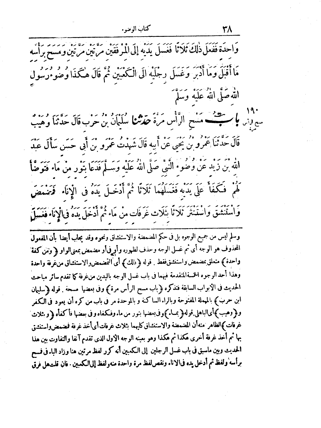 وسلّم ليس من جميع الوجوه بل في حكم المضمضة والاستنشاق ونحوه وقد يجاب أيضاً بأن المفعول المحذوف هو الوجه أي ثم غسل الوجه وحذف لظهوره وأو في أو مضمض بمعنى الواو (ومن كفة واحدة) متعلق بمضمض واستنشق فقط. قوله (ذلك) أي التمضمض والاستنشاق من غرفة واحدة وهذا أحد الوجوه الخمسة المتقدمة فيهما في باب غسل الوجه باليدين من غرفة كما تقدم سائر مباحث الحديث في الأبواب السابقة فتذكره (باب مسح الرأس مرة) وفي بعضها مسحة. قوله (سليمان ابن حرب) بالمهملة المفتوحة وبالراء الساكنة وبالموحدة مر في باب من كره أن يعود في الكفر و (وهيب) أي الباهلي. قوله (بماء) وفي بعضها بتور من ماء وفكفاه وفي بعضها فأكفأه (وبثلاث غرفات) الظاهر منه أن المضمضة والاستنشاق كليهما بثلاث غرفات أي أخذ غرفة فمضمض واستنشق بها ثم أخذ غرفة أخرى هكذا ثم هكذا وهو بعينه الوجه الأول الذي تقدم آنفاً والتفاوت بين هذا الحديث وبين ما سبق في باب غسل الرجلين إلى الكعبين أنه كرر لفظ مرتين هنا وزاد الباء في فمسح برأسه ولفظ ثم أدخل يده في الإناء ونقص لفظ مرة واحدة منه ولفظ إلى الكعبين. فإن قلت هل فرق