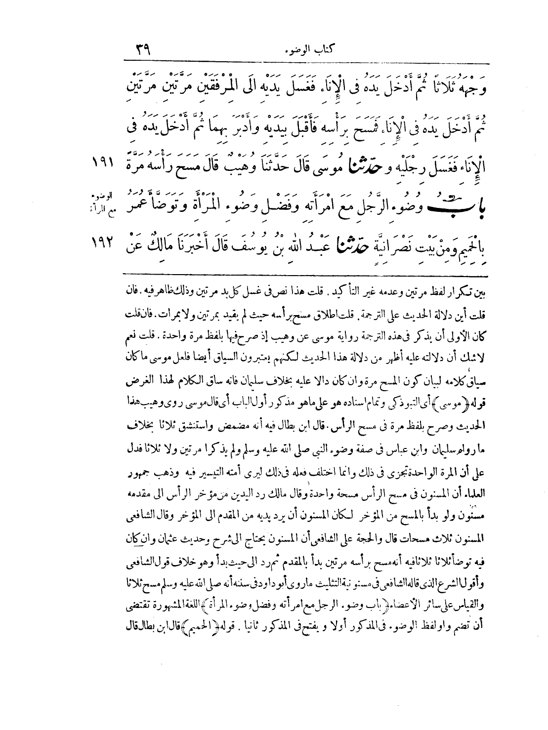 بين تكرار لفظ مرتين وعدمه غير التأكيد. قلت هذا نص في غسل كل يد مرتين وذلك ظاهر فيه. فإن قلت أين دلالة الحديث على الترجمة. قلت إطلاق مسح برأسه حيث لم يقيد بمرتين ولا بمرات. فإن قلت كان الأولى أن يذكر في هذه الترجمة رواية موسى عن وهيب إذ صرح فيها بلفظ مرة واحدة. قلت نعم لا شك أن دلالته عليه أظهر من دلالة هذا الحديث لكنهم يعتبرون السياق أيضاً فلعل موسى ما كان سياق كلامه لبيان كون المسح مرة وإن كان دالاً عليه بخلاف سليمان فإنه ساق الكلام لهذا الغرض قوله (موسى) أي التبوذكي وتمام إسناده هو على ما هو مذكور أول الباب أي قال موسى روى وهيب هذا الحديث وصرح بلفظ مرة في مسح الرأس قال ابن بطال فيه أنه مضمض واستنشق ثلاثاً بخلاف ما رواه سليمان وابن عباس في صفة وضوء النبي صَلَّى الله عليه وسلّم ولم يذكرا مرتين ولا ثلاثاً فدل على أن المرأة الواحدة تجزى في ذلك وإنما اختلف فعله في ذلك ليرى أمته التيسير فيه وذهب جمهور العلماء أن المسنون في مسح الرأس مسحة واحدة وقال مالك رد اليدين من مؤخر الرأس إلى مقدمه مسنون ولو بدأ بالمسح من المؤخر لكان المسنون أن يرد يديه من المقدم إلى المؤخر وقال الشافعي المسنون ثلاث مسحات قال والحجة على الشافعي أن المسنون يحتاج إلى شرح وحديث عثمان وإن كان فيه توضأ ثلاثاً ثلاثاً فيه أنه مسح برأسه مرتين بدأ بالمقدم ثم رد إلى حيث بدأ وهو خلاف قول الشافعي وأقول الشرع الذي قاله الشافعي في مسنونية التثليث ما روى أبو داود في سننه أنه صَلَّى الله عليه وسلّم مسح ثلاثاً والقياس على سائر الأعضاء (باب وضوء الرجل مع امرأته وفضل وضوء المرأة) اللغة المشهورة تقتضي أن تضم واو لفظ الوضوء في المذكور أولاً ويفتح في المذكور ثانياً. قوله (الحميم) قال ابن بطال قال