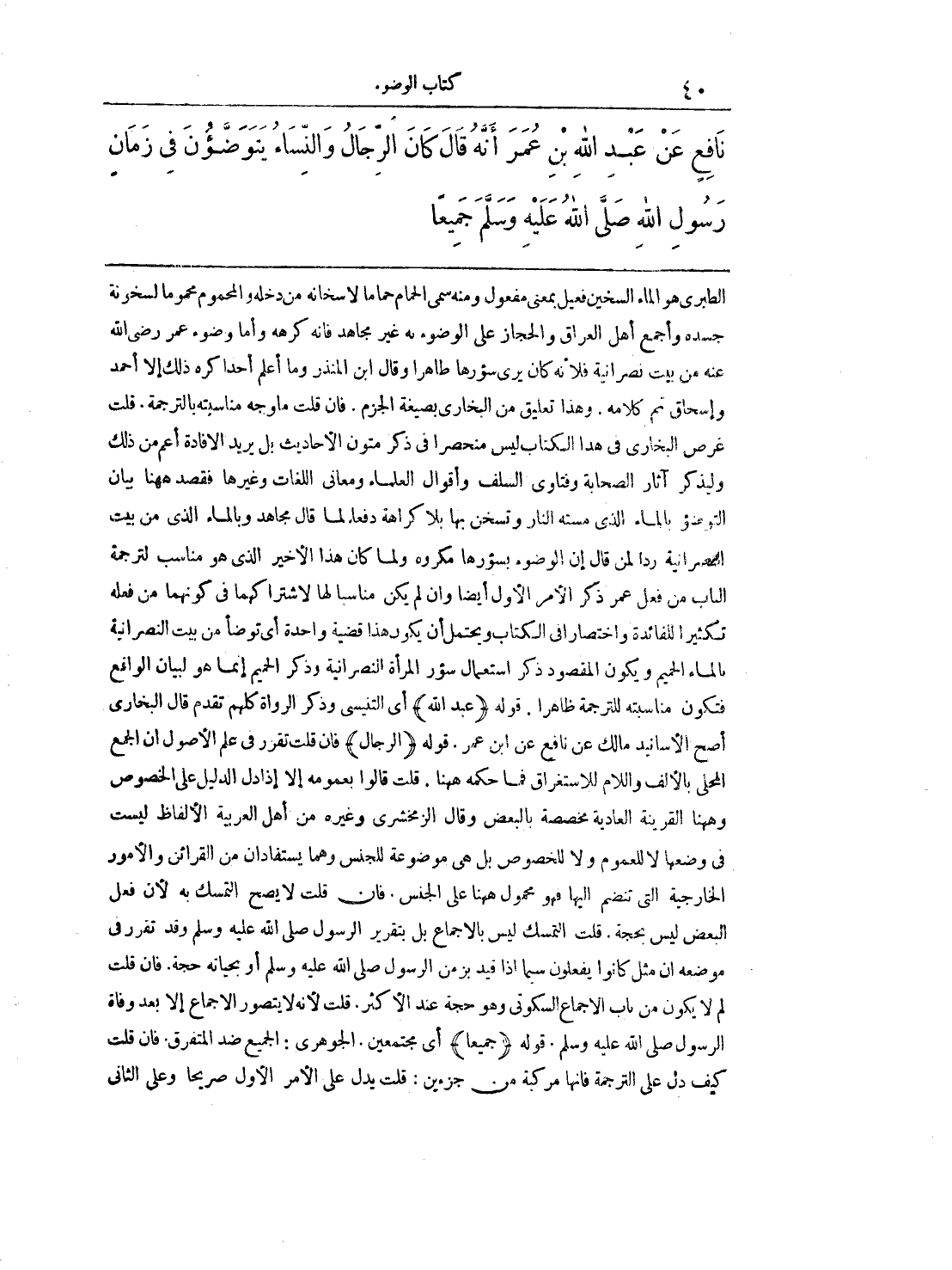 الطبري هو الماء السخين فعيل بمعنى مفعول ومنه سمى الحمام حماماً لا سخانه من دخله والمحموم محموماً لسخونة جسده وأجمع أهل العراق والحجاز على الوضوء به غير مجاهد فإنه كرهه وأما وضوء عمر رضي الله عنه من بيت نصرانية فلأنه كان يرى سؤرها طاهراً وقال ابن المنذر وما أعلم أحداً كره ذلك إلا أحمد وإسحاق تم كلامه. وهذا تعليق من البخاري بصيغة الجزم. فإن قلت ما وجه مناسبته بالترجمة. قلت عرض البخاري في هذا الكتاب لي منحصراً في ذكر متون الأحاديث بل يريد الإفادة أعم من ذلك وليذكر آثار الصحابة وفتاوى السلف وأقوال العلماء ومعاني اللغات وغيرها فقصد ههنا بيان التوضؤ بالماء الذي مسته النار وتسخن بها بلا كراهة دفعاً لما قال مجاهد وبالماء الذي من بيت النصرانية رداً لمن قال إن الوضوء بسؤرها مكروه ولما كان هذا الأخير الذي هو مناسب لترجمة الباب من فعل عمر ذكر الأمر الأول أيضاً وإن لم يكن مناسباً لها لاشتراكهما في كونهما من فعله تكثيراً للفائدة واختصاراً في الكتاب ويحمل أن يكون هذا قضية واحدة أي توضأ من بيت النصرانية بالماء الحميم ويكون المقصود ذكر استعمال سؤر المرأة النصرانية وذكر الحميم إنما هو لبيان الواقع فتكون مناسبته للترجمة ظاهراً. قوله (عبد الله) أي التنيسي وذكر الرواة كلهم تقدم قال البخاري أصح الأسانيد مالك عن نافع عن ابن عمر. قوله (الرجال) فإن قلت تقرر في علم الأصول أن الجمع المحلى بالألف واللام للاستغراق فما حكمه ههنا. قلت قالوا بعمومه إلا إذا دل الدليل على الخصوص وههنا القرينة العادية مخصصة بالبعض وقال الزمخشري وغيره من أهل العربية الألفاظ ليست في وضعها لا للعموم ولا للخصوص بل هي موضوعة للجنس وهما يستفادان من القرائن والأمور الخارجية التي تنضم إليها فهو محمول ههنا على الجنس. فإن قلت لا يصح التمسك به لأن فعل البعض ليس بحجة. قلت التمسك ليس بالإجماع بل بتقرير الرسول صَلَّى الله عليه وسلّم وقد تقرر في موضعه أن مثل كانوا يفعلون سيما إذا قيد بزمن الرسول صَلَّى الله عليه وسلّم أو بحياته حجة. فإن قلت لم لا يكون من باب الإجماع السكوتي وهو حجة عند الأكثر. قلت لأنه لا يتصور الإجماع إلا بعد وفاة الرسول صَلَّى الله عليه وسلّم. قوله (جميعاً) أي مجتمعين. الجوهري: الجميع ضد المتفرق. فإن قلت كيف دل على الترجمة فإنها مركبة من جزءين: قلت يدل على الأمر الأول صريحاً وعلى الثاني