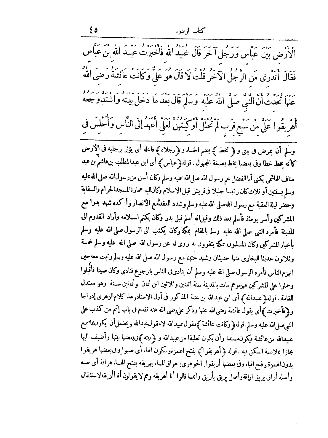 الأَرْضِ بَيْنَ عَبَّاسٍ وَرَجُلٍ آخَرَ. قَالَ عُبَيْدُ اللَّهِ فَأَخْبَرْتُ عَبْدَ اللَّهِ بْنَ عَبَّاسٍ فَقَالَ أَتَدْرِى مَنِ الرَّجُلُ الآخَرُ قُلْتُ لاَ قَالَ هُوَ عَلِىٌّ. وَكَانَتْ عَائِشَةُ - رضى الله عنها - تُحَدِّثُ أَنَّ النَّبِىَّ صَلَّى الله عليه وسلّم قَالَ بَعْدَ مَا دَخَلَ بَيْتَهُ وَاشْتَدَّ وَجَعُهُ