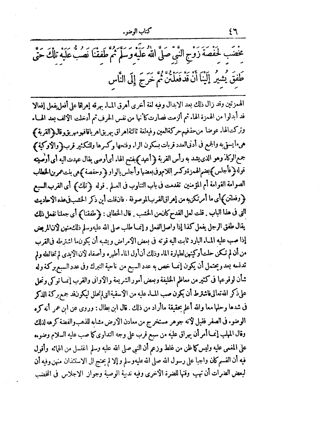 الهمزتين وقد زال ذلك بعد الإبدال وفيه لغة أخرى أهرق الماء يهرقه إهراقاً على أفعل يفعل إفعالاً قد أبدلوا من الهمزة الهاء ثم ألزمت فصارت كأنها من نفس الحرف ثم أدخلت الألف بعد الهاء وتركت الهاء عوضاً من حذفهم حركة العين وفيه لغة ثالثة إهراق يهريق إهرياقاً فهو مهريق وقال (القربة) هي ما يسقى به والجمع في أدنى العدد قربات بسكون الراء وفتحها وكسرها وللتكثير قرب (والأوكية) جمع الوكاء وهو الذي يشد به رأس القربة (أعهد) بفتح الهاء أي أوصى يقال عهدت إليه أي أوصيته قوله (فأجلس) بضم الهمزة وكسر اللام وفي بعضها وأجلس بالواو (وحفصة) هي بنت عمر بن الخطاب الصوامة القوامة أم المؤمنين تقدمت في باب التناوب في العلم. قوله (تلك) أي القرب السبع (وفعلتن) أي ما أمرتكن به من إهراق القرب الموصوفة. فإن قلت أين ذكر الخشب في هذه الأحاديث التي في هذا الباب. قلت لعل القدح كان من الخشب. قال الخطابي: (طفقنا) أي جعلنا نفعل ذلك يقال طفق الرجل يفعل كذا إذا واصل الفعل وإنما طلب صَلَّى الله عليه وسلّم ذلك منهن لأن المريض إذا صب عليه الماء البارد ثابت إليه قوته في بعض الأمراض ويشبه أن يكون ما اشترطه في القرب من أن لم تكن حلت أوكيتهن لطهارة الماء وذلك أن أول الماء أطهره وأصفاه لأن الأيدي لم تخالطه ولم تدفعه بعد ويحتمل أن يكون إنما خص به عدد السبع من ناحية التبرك وفي عدد السبع بركة وله شأن لوقوعها في كثير من معاظم الخليفة وبعض أمور الشريعة والأواني والقرب إنما توكى وتحل على ذكر الله تعالى فاشترط أن يكون صب الماء عليه من الأسقية التي لم تحلل ليكون قد جمع بركة الذكر في شدها وحلها معاً والله أعلم بحقيقة ما أراد من ذلك. قال ابن بطال: وروى عن ابن عمر أنه كره الوضوء في الصغر فقيل لأنه جوهر مستخرج من معادن الأرض مشابه للذهب والفضة كرهه لذلك وقال المهلب إنما أمر أن يهراق عليه من سبع قرب على وجه التداوي كما صب عليه السلام وضوءه على المغمى عليه وليس كما ظن من غلظ وزعم أن النبي صَلَّى الله عليه وسلّم اغتسل من إغمائه وأقول فيه أن القسم كان واجباً على رسول الله صَلَّى الله عليه وسلّم وإلا لم يحتج إلى الاستئذان منهن وفيه أن لبعض الضرات أن تهب وقتها للضرة الأخرى وفيه ندبية الوصية وجواز الأجلاس في المخضب