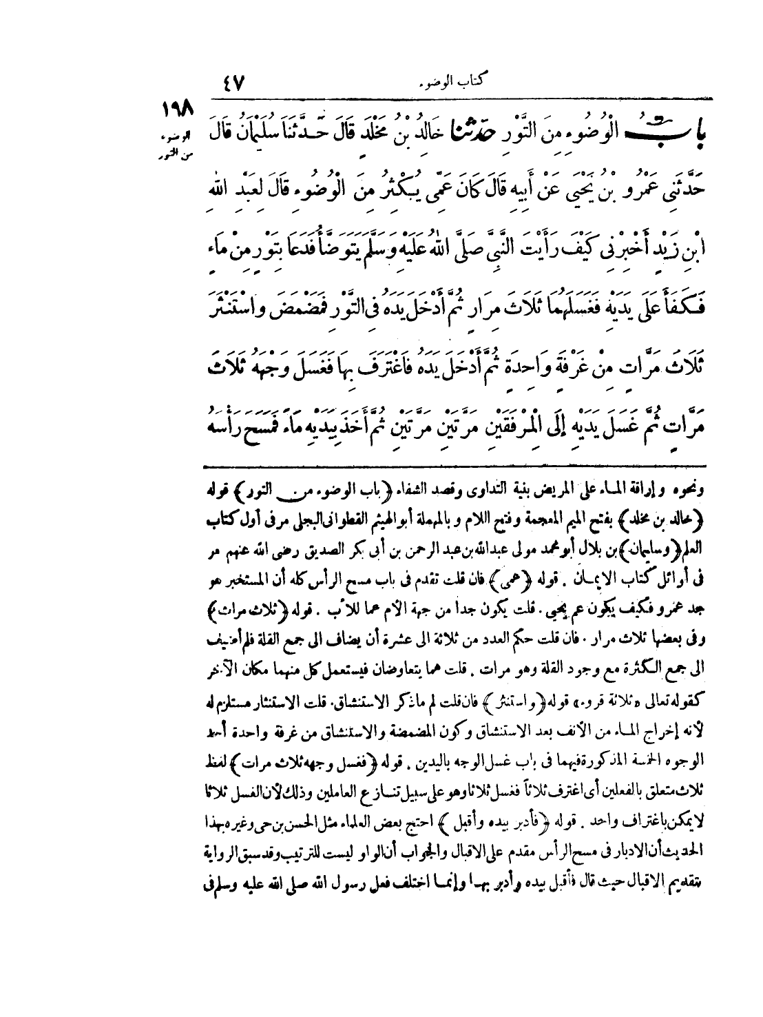 198 - حَدَّثَنَا خَالِدُ بْنُ مَخْلَدٍ قَالَ حَدَّثَنَا سُلَيْمَانُ قَالَ حَدَّثَنِى عَمْرُو بْنُ يَحْيَى عَنْ أَبِيهِ قَالَ كَانَ عَمِّى يُكْثِرُ مِنَ الْوُضُوءِ، قَالَ لِعَبْدِ اللَّهِ بْنِ زَيْدٍ أَخْبِرْنِى كَيْفَ رَأَيْتَ النَّبِىَّ صَلَّى الله عليه وسلّم يَتَوَضَّأُ فَدَعَا بِتَوْرٍ مِنْ مَاءٍ، فَكَفَأَ عَلَى يَدَيْهِ فَغَسَلَهُمَا ثَلاَثَ مِرَارٍ، ثُمَّ أَدْخَلَ يَدَهُ فِى التَّوْرِ، فَمَضْمَضَ وَاسْتَنْثَرَ ثَلاَثَ مَرَّاتٍ مِنْ غَرْفَةٍ وَاحِدَةٍ، ثُمَّ أَدْخَلَ يَدَهُ فَاغْتَرَفَ بِهَا فَغَسَلَ وَجْهَهُ ثَلاَثَ مَرَّاتٍ، ثُمَّ غَسَلَ يَدَيْهِ إِلَى الْمِرْفَقَيْنِ مَرَّتَيْنِ مَرَّتَيْنِ، ثُمَّ أَخَذَ بِيَدِهِ مَاءً، فَمَسَحَ رَاسَهُ