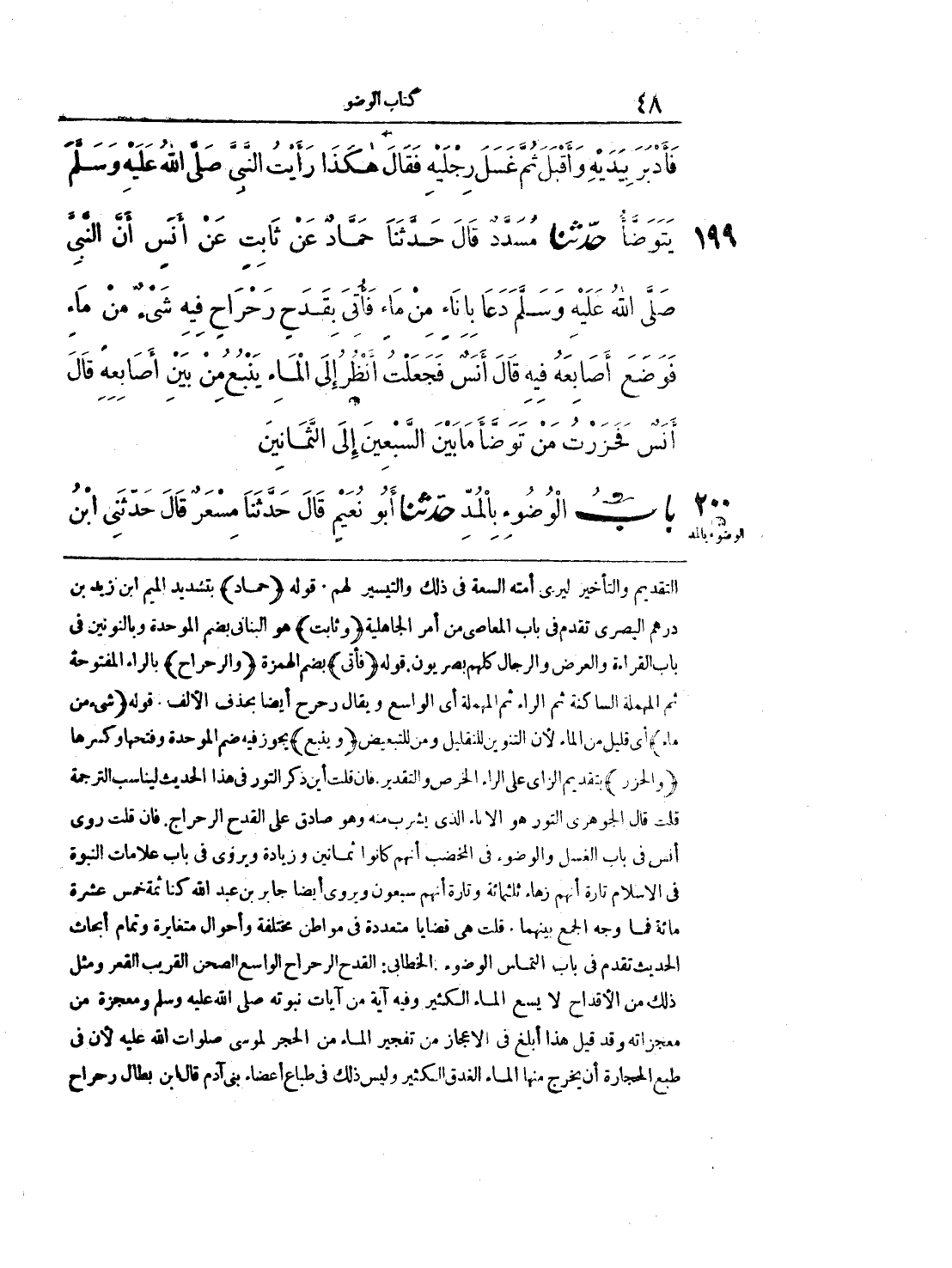 التقديم والتأخير ليرى أمته السعة في ذلك والتيسير لهم. قوله (حماد) بتشديد الميم ابن زيد بن درهم البصري تقدم في باب المعاصي من أمر الجاهلية (وثابت) هو البناني بضم الموحدة وبالنونين في باب القراءة والعرض والرجال كلهم بصريون. قوله (فأتى) بضم الهمزة (والرحراح) بالراء المفتوحة ثم المهملة الساكنة ثم الراء ثم المهملة أي الواسع ويقال رحرح أيضاً بحذف الألف. قوله (شئ من ماء) أي قليل من الماء لأن التنوين للتقليل ومن للتبعيض (وينبع) يجوز فيه ضم الموحدة فتحها وكسرها (والحزر) بتقديم الزاي على الراء الخرص والتقدير. فإن قلت أين ذكر التور في هذا الحديث ليناسب الترجمة قلت قال الجوهري التور هو الإناء الذي يشرب منه وهو صادق على القدح الرحراح. فإن قلت روى أنس في باب الغسل والوضوء في المخضب أنهم كانوا ثمانين وزيادة ويروى في باب علامات النبوة في الإسلام تارة أنهم زهاء ثلثمائة وتارة أنهم سبعون ويروى أيضاً جابر بن عبد الله كنائمة خمس عشرة مائة فما وجه الجمع بينهما. قلت هي قضايا متعددة في مواطن مختلفة وأحوال متغايرة وتمام أبحاث الحديث تقدم في باب التماس الوضوء. الخطابي: القدح الرحراح الواسع الصحن القريب القعر ومثل ذلك من الأقداح لا يسع الماء الكثير وفيه آية من آيات نبوته صَلَّى الله عليه وسلّم ومعجزة من معجزاته وقد قيل هذا أبلغ في الإعجاز من تفجير الماء من الحجز لموسى صلوات الله عليه لأن في طبع الحجارة أن يخرج منها الماء الغدق الكثير وليس ذلك في طباع أعضاء بني آدم قال ابن بطال رحراح