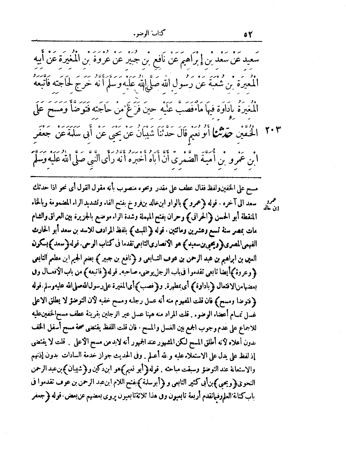 مسح على الخفين ولفظ فقال على مقدر ومحوه منصوب بأنه مقول القول أي نحو إذا حدثك عمر ابن خالد سعد إلى آخره. قوله) عمرو (بالواو ابن خالد بن فروخ بفتح الفاء وتشديد الراء المضمومة وبالخاه المنقطة أبو الحسن الحرانى. وحران بفتح المهملة وشدة الراء موضع بالجزيرة بين العراق والشام مات بمصر سنة تسع وعشرين ومائتين. قوله) الليث (بلفظ المرادف للأسد بن سعد أبو الحارث الفهمي المصري) ويحي بن (هو الأنصاري التابعي تقدما في كتاب الوحي. قوله) سعد (بسكون العين بن إبراهيم بن عبد الرحمن بن عوف التابعي ونافع بن جبير (بضم الجيم ابن مطعم التابعي) وعروة (أيضا تابعي تقدموا في باب الرحيل يوضئ صاحبه قوله) فاتبعه (من باب الأفعال وفى بعضها من الأفعال) باداوة (أي بمظهره. و) فصب (أي المغيرة على رسول الله صلى الله عليه وسلم. قوله) فتوضأ ومسح (فان قلت المفهوم منه أنه عسل رجله ومسح خفيه لأن التوضؤ لا يطلق الأعلى غسل تمام أعضاء الوضوء. قلت المراد منه هنا عسل عير الرجلين بقرينة عطف مسح الخفين عليه للإجماع علي عدم وجوب الجمع بين الغسل والمسح. فان قلت اللفظ يقتضي صحة مسح أسفل الخف بدون أعلاه لأنه أطلق المسح لكن المشهور عند الجمهور أنه لابد من مسح الأعلى. قلت لا يقتضي إذ لفظ على يدل على الاستعلاء عليه والله علم. وفي الحديث جواز خدمة السادات بدون إذنهم والاستعانة عند التوضؤ وسبقت مباحثه. قوله) أو نعيم (هو ابن دكين و) شيبان (بن عبد الرحمن النحوي) ويحي (بن أبي كثير التابعي و) أبو سلة (بفتح اللاّم ابن عبد الرحمن بن عوف تقدموا فى باب كتابه العلم وفيما تقدم أربعة تابعيون وفى ثلاثة بعيون يروى عن بعض. قوله (جعفر)
