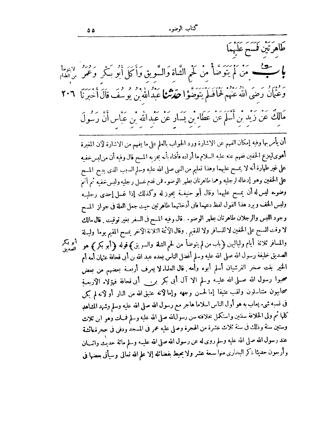 أن يأمر بها وفيه إمكان الفهم عن الإشارة ورد الجواب بالعلم على ما يفهم من الإشارة لأن المغيرة أهوي لينزع الخفين ففهم عنه عليه السلام ما أراده فأفتاه بأنه يجزيه المسح قال وفيه أن من لبس خفيه عللا غير طهارة أنه لا يمسح عليهما وهذا تعليم من النبي صلى الله عليه وسلم السبب الذي يتيح المسح على الخفين وهو أداخله لرجليه وهما طاهرتان بطهر الوضوء فمن قدم غسل رجليه ولبس خفيه ثم وضوئه ليس له أن يمسح عليهما وقال أبو حنيفة يجوز له وكذلك إذا غسل احدى رجليه ولبس الخف ويرد هذا القول لفظ دعمها فإني أدخلتهما طاهرتين حيث جعل العلة فى جواز المسح وجود اللبس والرجلان طاهرتين بطهر الوضوء. قال وفيه المسح في السفر بغير توقيت. قال مالك لا وقت للمسح على الخفين لا للمسافر ولا للقيم. وقال الأئمة الثلاثة الأخر يمسح المقيم يوما وليلة والمسافر ثلاثة أيام ولياليهن) باب من لم يتوضأ من لحم الشاة والسويق (قوله:) أبوبكر (هو أبو بكر الصديق خليفة الله صلى الله عليه وسلم أفضل الناس بعده عبد الله بن أبى قحافة عثمان أمه أم الخير بنت صخر القريشان أسلم أبوه وأمه. قال العلماء لا يعرف أربعة بعضهم من بعض صحبوا رسول الله صلى الله عليه وسلم الا أل أبى بكر بن أبى قحافة فهؤلاء الأربعة صحابيون متناسلون ولقب عتيقا اما لحسن وجهه واما لأنه عتيق الله من النار أو لأنه لم يكن فى نسبه شئ يعاب به هو أول الناس اسلاما هاجر مع رسول الله صلى الله عليه وسلم وشهد المشاهد كلها ثم ولى الخلافة سنتين واستكمل بخلافته من رسول الله صلى الله عليه وسلم فمات وهو ابن ثلاث وستين سنة وذلك فى ثلاث عشرة من الهجرة وصلى عمر فى المسجد ودفن فى حجرة عائشة عند رسول الله صلى الله عليه وسلم روى له عن رسول الله عليه وسلم مائة حديث واثنان وأربعون حديثا ذكر البخاري منها سبعة عشر ولايحيط بفضائله إلا علم الله تعالى وسيأتي بعضها في