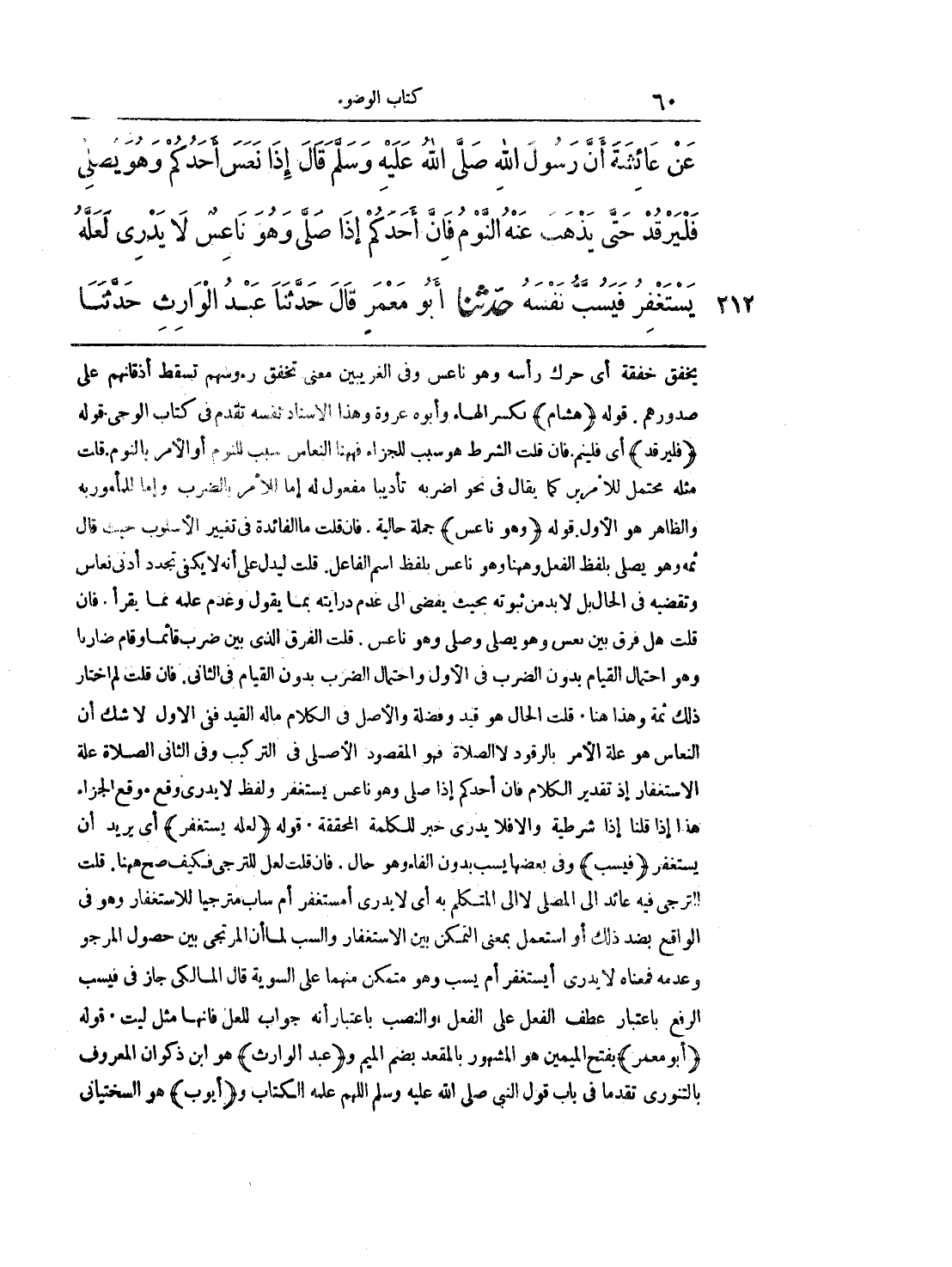 يخفق خفقة أي حرك رأسه وهو ناعس وفى الغر بين معني تخفق رؤوسهم تسقط أذقانهم غلي صدورهم قوله) هشام (بكسر الهاء وأبوه عروة وهذا الاسناد نفسه تقدم فى كتاب الوحى قوله) فليرقد (أي فلينام فان قلت الشرط هو السبب للجزاء فهنا النعاس سبب النوم أو للأمر بالنوم قلت مثله محتمل للأمر كما يقال في نحو اضرابه تأديبا مفعول له اما للأمر بالضرب واما للمأمورية والظاهر هو الأول قوله) هوناعس (جملة حالية فان قلت مالفائدة في تغير الأسلوب حيث قال ثمة وهو يصلي بلفظ الفعل وهمنا وهو ناعس بلفظ اسم الفاعل قلت ليدل على أنه لايكفي أدني نعاس وتقضبة في الحال بل لابد من ثبوته بحيث بقضي الى عدم درايته بما يقول وعدم علمه مما يقرأ فأن قلت هل فرق بين نعس وهو يصلي وصلي وهو ناعس قلت الفرق الذي بين ضرب قائما وقام ضاربا وهو احتمال القيام بدون الضرب فة الاول واحتمال الضرب بدون القيام فى الثانى. فان قلت لم اختار ذلك ثمة وهذا هنا. قلت الحال هو قيد وفضله والأصل فى الكلام ماله القيد ففى الاول لاشك أن النعاس هو علة الأمر بالرقود لا الصلاة فهو المقصود الأصلي فى التركيب وفى الثاني الصلاة علة الاستغفار اذا تقدير الكلام فان أحدكم اذا صلى وهو ناعس يستغفر ولفظ لا يدري وفع موقع الجزاء هذا اذا قلنا شرطية والا فلا يدري خبر للكلمة المحققة قوله) لعله يستغفر (أي يريد أن يستغفر) فيسب (وفي بعضها يسب بدون الفاء وهو حال. فان قلت لعل للترجي فكيف صح همنا قلت الترجي فيه عائد الي المصلى لا الى المتكلم به أى لا يدري أمستغفر أم ساب مترجيا للأستغفار وهو فى الواقع بضد ذلك أو استعمال بمعنى التمكن بين الاستغفار والسب لما أن المرتجي بين حصول المرجو وعدمه فمعناه لا يدري أيستغفر أم يسب وهو متمكن منها على السوية قال المالكي جاز في فيسب الرفع باعتبار عطف الفعل على الفعل والنصب باعتبار أنه جواب للعل فانها مثل ليت قوله) أبو معمر (بفتح الميمن هو اللمشهور بالمقعد بضم الميم و) عبد الوارث (هو ابن ذكر ان المعروف بالتنورى تقدما فى باب قول النبى صلي الله عليه وسلم علمه و) أيوب (هو السختياني