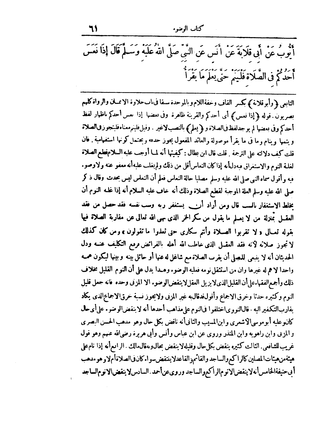 التابعي و) أبو قلابة بكسر القاف وخفة اللام وبالموحدة سبقا فى باب حلاوة الايمان والرواة كلهم بصريون قوله) اذا نعس (أي أحدكم والقرينة ظاهرة وفى بعضها اذا نعس أحدكم باظهار لفظ أحدكم وفى بعضها لم يوجد لفظ فى الصلاة و) يعلم (بالنصب لا غير وقيل فلم معناه فليتجوز في الصلاة ويتمها وينام وما فى يقرأ موصولة والعائد المفعول يجوز حدفه ويحتمل كونها استفهامه فان قلت كيف دلالته على الترجمة قلت قال ابن بطال كيفتها أنه لما أوجب عليه السلام قطع الصلاة لغلته النوم والاستغراق فيه دل أنه اذا كان النعاس أقل من ذلك ولم يغلب عليه أنه معفو عنه ولا وضوء فيه وأقوال سماه النبي صلي الله عليه وسلم مصلبا حالة النعاس فعلم أن النعاس ليس بحدث وقال ذكر صلي الله عليه وسلم لقطع الصلاة وذلك أنه خاف عليه السلام أنه اذا غله النوم أن يخلط الاستغفار بالسب قال ومن أراد أن يستغفر ربه وسب نفسه فقد حصل من فقد العقل بمنزله من لا يعلم ما يقول من سكر الخمر الذي نهي الله تعالي عن مقاربة الصلاة فيها بقوله تعالي < لا تقربوا الصلاة وأنتم سكارى حتي تعلموا ما تقولون > ومن كان كذلك لا تجوز صلاته لأنه فقد العقل الذي خاطب الله أهله بالفرائض فرفع التكليف عنه ودل الحديثان أنه لا ينبغي للمصلي أن يقرب الصلاة مع شلغل له أو حائل بينه ليكون همه واحدا لا هم له غيرها وان من استقل نومه فعليه الوضوء وهدا يدل علي أن النوم القليل مخلاف لذلك وأجمع الفقهاء علي أن القليل الذي لا يزيل العقل لا ينقض الوضوء الا المزنى وحده فأنه حعل قليل النوم وكثيرة حدثا وخرق الاجماع وأقوال قد قال به غير المزني ولا يجوز نسبة خرق الاجماع الذي يكاد يقارب التكفير اليه. قال النووي اختلفوا في النوم علي مذاهب أحدها أنه لا ينقض الوضوء على أي حال كان وعليه أبو موسي الأشعري وابن المسيب والثاني أنه ناقض بكل حال وهو مذهب الحسن البصري والمزبي وابن راهوية وابن المنذر وروي عن ابن عباس وأنس وأبي هريرة رضي الله عنهم وهو قول غريب للشافعي الثالث كثيرة ينقض بكل حال وقليلة لا ينقض بحال قال مالك الرابع أنه اذا نام علي هيئة من هيئات المصلين كالراكع والساجد القائم والقاعد لا ينقض سواء كان في الصلاة أم لا وهو مذهب أبي حنيفة الخامس أنه لا ينقض الا نوم الراكع والساجد وروي عن أحمد السادس لا ينقض الا نوم الساجد