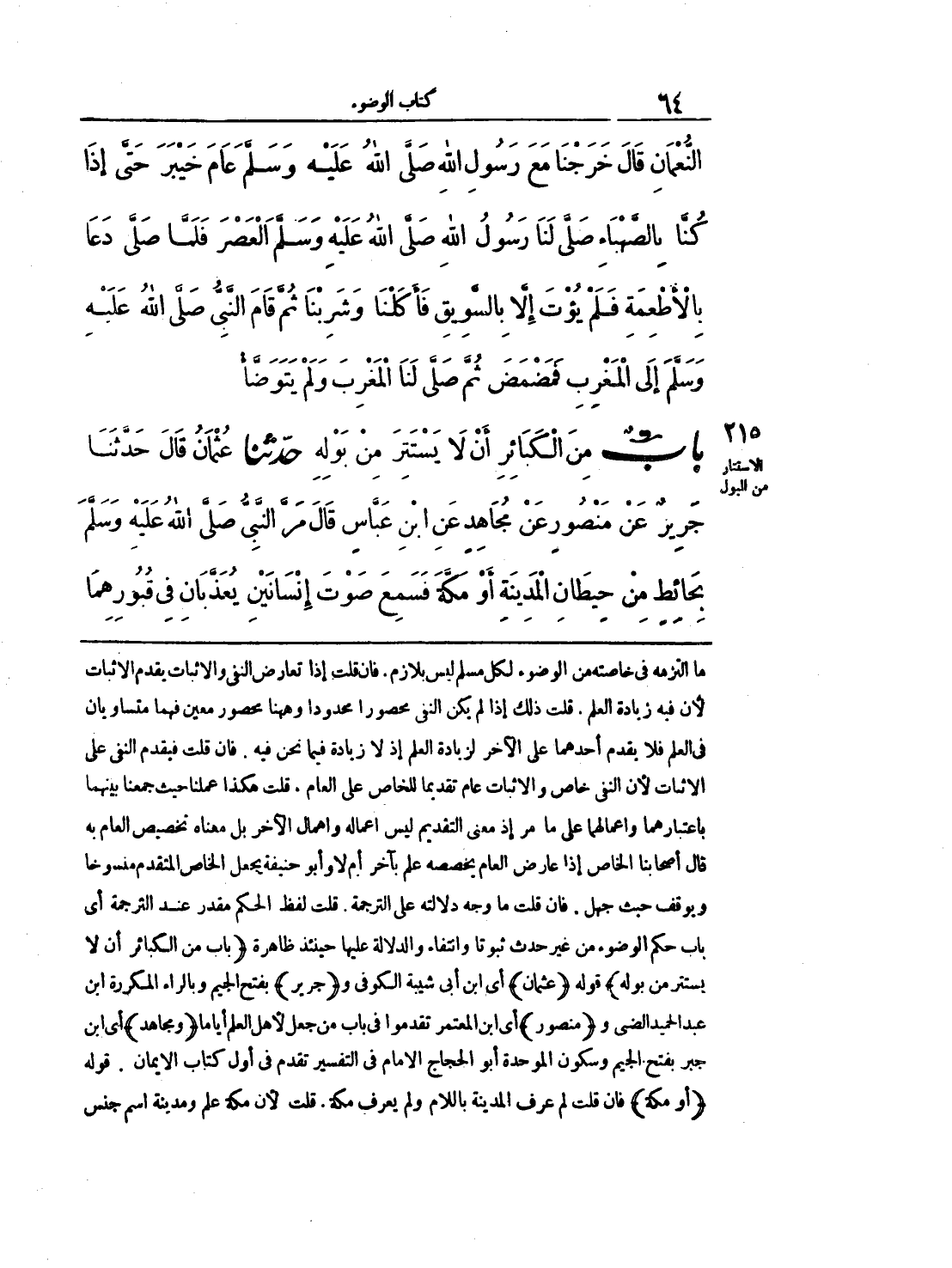 ما التزمه في خاصته من الوضوء لكل مسلم ليس بلازم فان قلت اذا تعارض النفي والاثبات يقدم الاثبات لأن فيه زيادة العلم قلت ذلك اذا لم يكن النفي محصورا محدودا وهنا محصور معين فهما متساوين في العلم فلا يقدم أحدهما علي الآخر لزيادة العلم اذا لا زيادة فيما نحن فيه فان قلت فيقدم النفي علي الاثبات لأن النفي خاص والاثبات عام تقديما للخاص علي العام. قلت هكذا عملنا حيث جمعنا بينهما باعتبارهما واعمالهما علي ما مر اذا معني التقديم ليس اعماله واهمال الآخر بل معناه تخصيص العام به قال أصحابنا الخاص اذا عارض العام يخصصه علم بالآخر أم لا وأبو حنيفة يجعل الخاص المتقدم منسوخا ويوقف حيث جهل. فان قلت ما وجه دلالته علي الترجمة قلت لفظ الحكم مقدر عند الترجمة أي باب حكم الوضوء من غير حدث ثبوتا وانتقاء والدلالة عليها حينئذ ظاهرة) باب من الكبائر أن لا يستتر من بوله (قوله) عثمان (أى ابن أبي شيبة الكوفي و) جرير (بفتح الجيم وبالراء المكررة ابن عبد الحميد الضي و) منصور (أي ابن المعتمر تقدموا في باب من جعل لأهل العلم أياما) ومجاهد (أي ابن جبر بفتح الجيم وسكون الموحدة أبو الحجاج الامام في التفسير تقدم في أول كتاب الايمان قوله) أو مكة (فان قلت لم عرف المدينة باللام ولم يعرف مكة. قلت لأن مكة علم ومدينة اسم جنس
