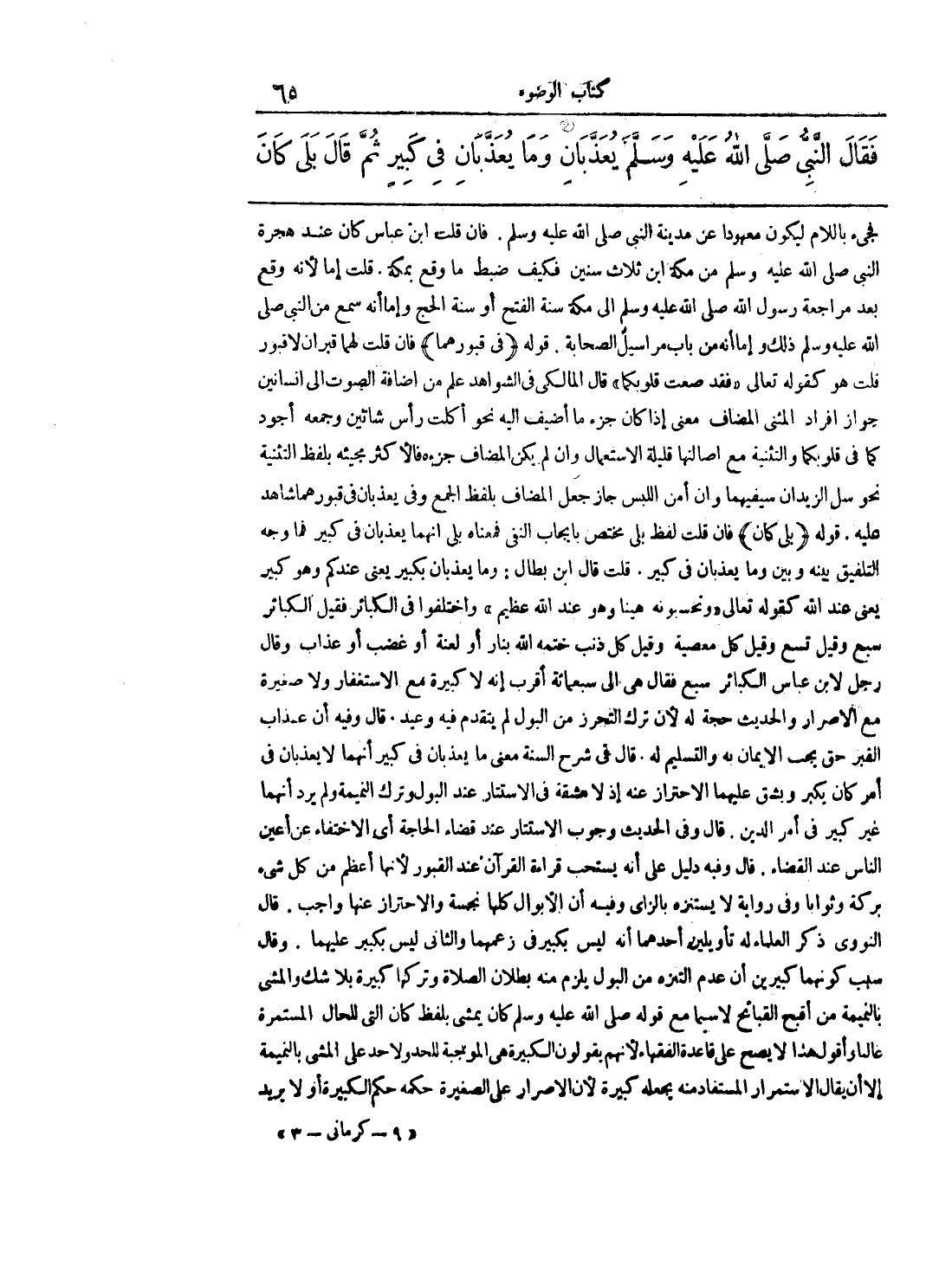 فجئ باللام ليكون معهودا عن مدينة النبي صلي الله عليه وسلم. فان قلت ابن عباس كان عنده هجرة النبي صلي الله عليه وسلم من مكة ابن ثلاث سنين فكيف ضبط ما وقع بمكة قلت اما لأنه وقع بعد مراجعة رسول الله صلي الله عليه وسلم الي مكة سنة الفتح أو سنة الحج وأما أنه سمع من النبي صلي الله عليه وسلم ذلك وأما أنه من باب مراسيل الصحابة قوله) في قبورهما (فان قلت لهما قبران لا قبور قلت هو كقوله تعالي< فقد صعت قلوبكما> قال المالكي في الشواهد علم من اضافة الصوت الي أنسانين جواز افراد المثني المضاف معني اذا كان جزء ما أضيف اليه نحو أكلت رأس شاتين وجمعه أجود كما في قلوبكم والثنية مع اصالتها قليلة الاستعمال وان لم يكن المضاف جزءه فاللأكثر مجيئه بلفظ الثنية نحو سل الزيدان سيفيهما وان أمن اللبس جاز جعل المضاف بلفظ الجمع وفي يعذبان في كبير فما وجه التلفيق بينه وبين وما يعذبان في كبير. قلت ابن بطال وما يعذبان بكبير يعني عندكم وهو كبير يعني عند الله كقوله تعالي < وتحسبونه هينا وهو عند الله عظيم > واختلفوا في الكبائر فقيل الكبائر سبع وقيل كل معصية وقيل كل ذنب ختمه الله بالنار أو لعنة أو غضب أو عذاب وقال رجل لابن عباس الكبائر سبع فقال هي الي سبعمائة أقرب انه لا كبيرة مع الاستغفار ولا صغيرة مع الاصرار والحديث حجة له لأن ترك التحرز من البول لم يتقدم فيه وعيد قال وفيه أن عذاب القبر حق يجب الايمان به والتسليم له قال في شرح السنة معني ما يعذبان في كبير أنهما لا يعذبان في أمر كان يكبر وبشق عليهما الاحتراز عنه اذا لا مشقة في الاستتار عند قضاء الحاجة أي الاختفاء عن أعين الناس عند القضاء قال وفيه دليل علي أنه يستجب قراءة القرآن عند القبور لأنها أعظم من كل شئ بركة وثوابا وفي راوية لا يستره بالزاي وفيه أن الأبوال كل نجسة والاحتراز عنها واجب. قال النووى ذكر العلماء له تأويلين أحدهما أنه ليس بكبير في زعمهما والثاني ليس بكبير عليهما. وقال سهب كونهما كبيرين أن عدم التنزه من البول يلزم منه بطلان الصلاة وتركها كبيرة بلا شك والمشي بالنميمة من أقبح القبائح لاسيما مع قوله صلي الله عليه وسلم كان يمشي بلفظ كان التي للحال المستمرة عاليا وأقوال هذا لا يصح علي قاعدة الفقهاء لأنهم يقولون الكبيرة هي الموجبة للحدو لا حد علي المشي بالنميمة الا أن يقال الاستمرار المستفاد منه يجعله كبيرة لأن الاصرار علي الصغيرة حكمه حكم الكبيرة أو لا يريد