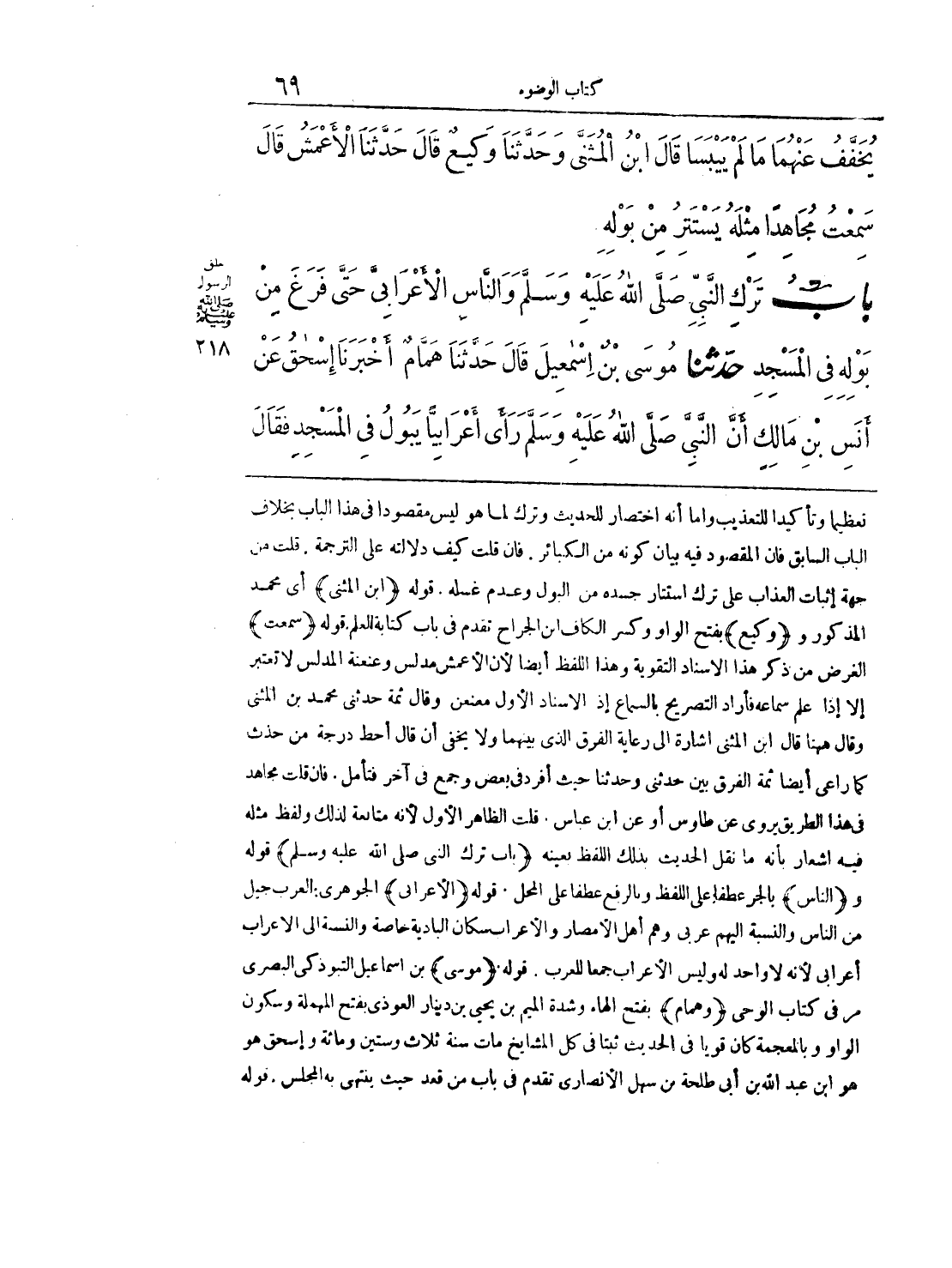 218 - حَدَّثَنَا مُوسَى بْنُ إِسْمَاعِيلَ قَالَ حَدَّثَنَا هَمَّامٌ أَخْبَرَنَا إِسْحَاقُ عَنْ أَنَسِ بْنِ مَالِكٍ أَنَّ النَّبِىَّ صَلَّى الله عليه وسلّم رَأَى أَعْرَابِيًّا يَبُولُ فِى الْمَسْجِدِ فَقَالَ.