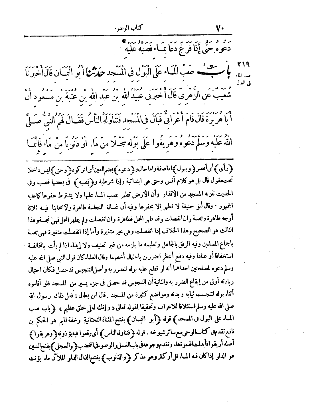 219 - حَدَّثَنَا أَبُو الْيَمَانِ قَالَ أَخْبَرَنَا شُعَيْبٌ عَنِ الزُّهْرِىِّ قَالَ أَخْبَرَنِى عُبَيْدُ اللَّهِ بْنُ عَبْدِ اللَّهِ بْنِ عُتْبَةَ بْنِ مَسْعُودٍ أَنَّ أَبَا هُرَيْرَةَ قَالَ قَامَ أَعْرَابِىٌّ فَبَالَ فِى الْمَسْجِدِ فَتَنَاوَلَهُ النَّاسُ، فَقَالَ لَهُمُ النَّبِىُّ صَلَّى الله عليه وسلّم «دَعُوهُ وَهَرِيقُوا عَلَى بَوْلِهِ سَجْلاً مِنْ مَاءٍ، أَوْ ذَنُوباً مِنْ مَاءٍ، فَإِنَّمَا