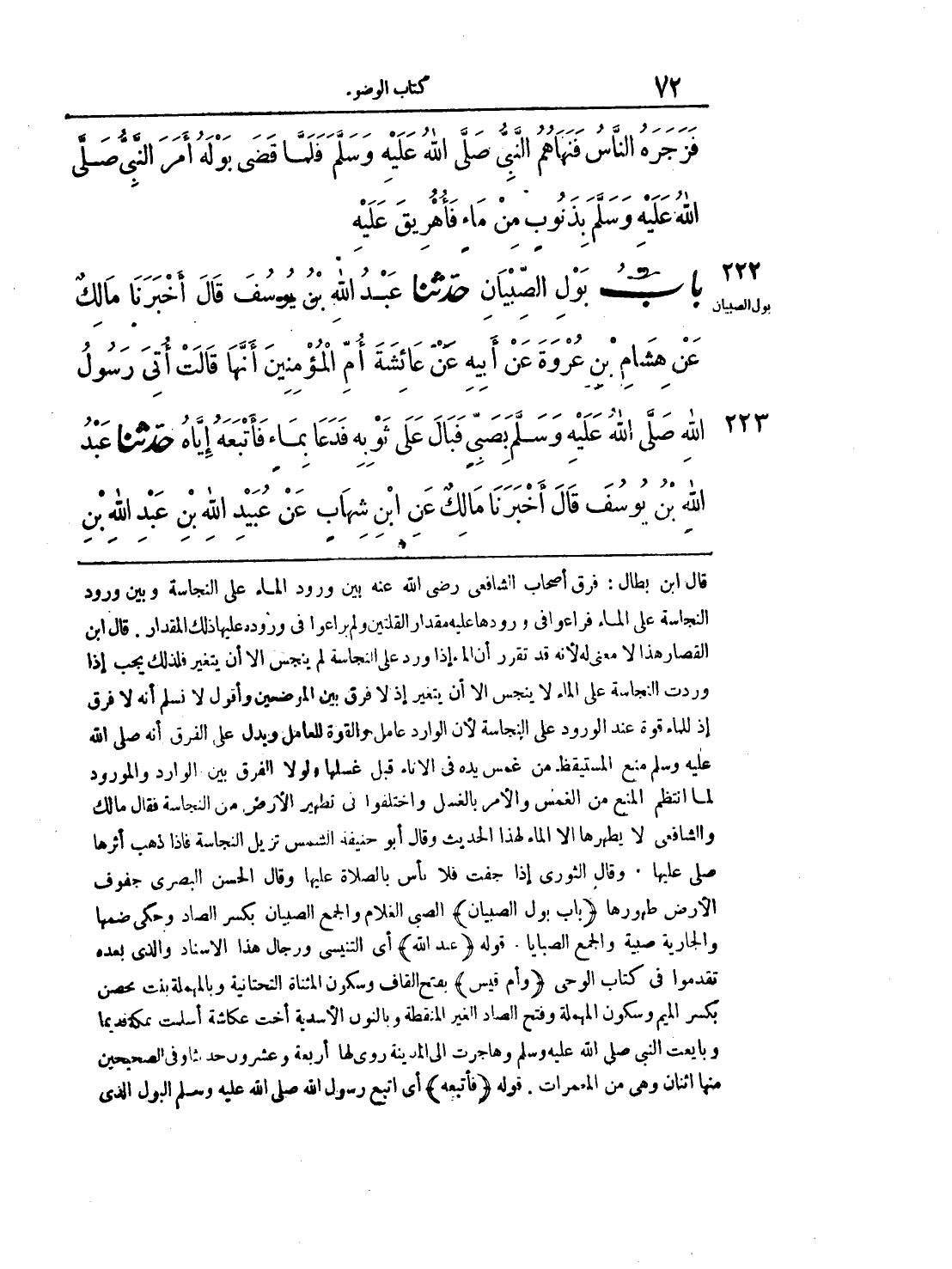 222 - حَدَّثَنَا عَبْدُ اللَّهِ بْنُ يُوسُفَ قَالَ أَخْبَرَنَا مَالِكٌ عَنْ هِشَامِ بْنِ عُرْوَةَ عَنْ أَبِيهِ عَنْ عَائِشَةَ أُمِّ الْمُؤْمِنِينَ أَنَّهَا قَالَتْ أُتِىَ رَسُولُ اللَّهِ صَلَّى الله عليه وسلّم بِصَبِىٍّ، فَبَالَ عَلَى ثَوْبِهِ، فَدَعَا بِمَاءٍ فَأَتْبَعَهُ إِيَّاهُ.