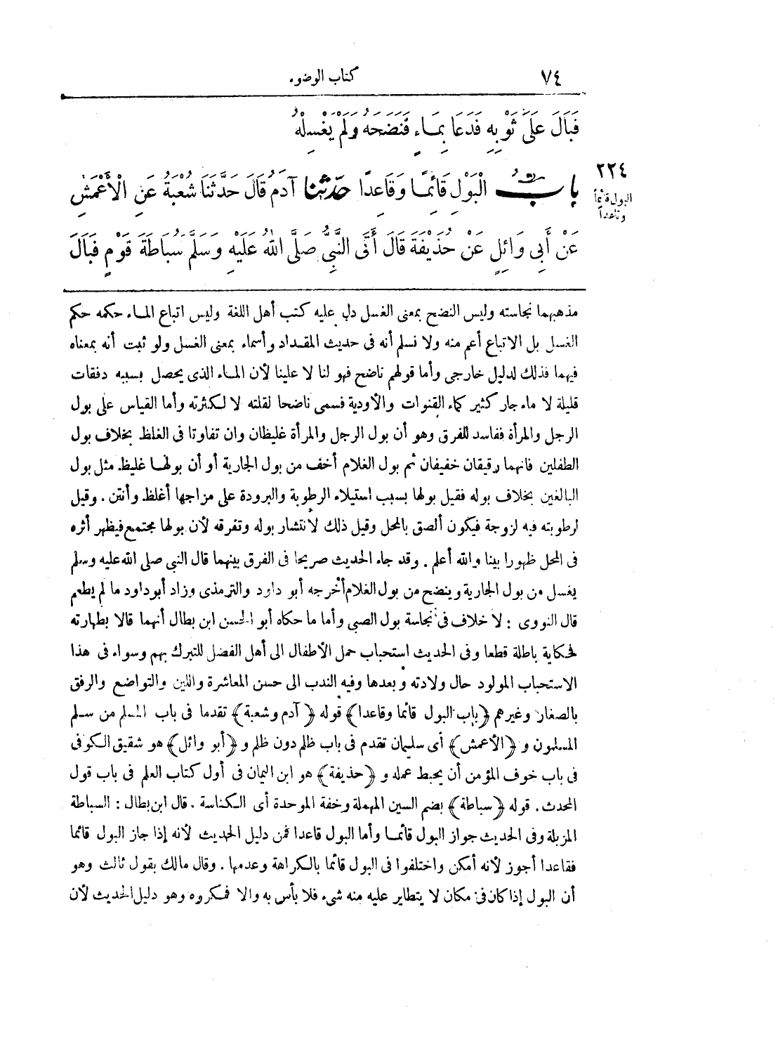 224 - حَدَّثَنَا آدَمُ قَالَ حَدَّثَنَا شُعْبَةُ عَنِ الأَعْمَشِ عَنْ أَبِى وَائِلٍ عَنْ حُذَيْفَةَ قَالَ أَتَى النَّبِىُّ صَلَّى الله عليه وسلّم سُبَاطَةَ قَوْمٍ فَبَالَ