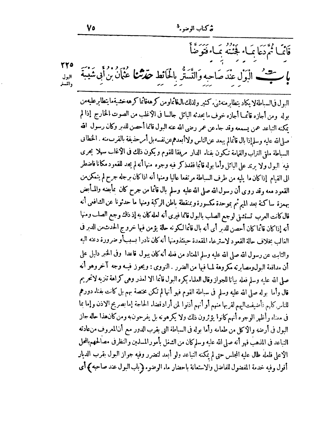 البول في السباطة لا يكاد يتطاير منه شيء كثير ولذلك بال قائما ومن كرهه قائما كرهه خشية ما يتطاير عليه من بوله ومن أجازه قائما أجازه خوف ما يحدثه البائل جالسا في الأغلب من الصوت الخارج إذا لم يمكنه التباعد عمن يسمعه وقد جاء عن عمر رضي الله عنه البول قائما أحصن للدبر وكان رسول الله صلى الله عليه وسلم إذا بال قائما لم يبعد عن الناس ولا أبعدهم عن نفسه بل أمر حذيفة بالقرب منه. الخطابي السباطة ملقى التراب والقمامة تكون بفناء الدار مرفقا للقوم ويكون ذلك في الأغلب سهلا يجري فيه البول ولا يرتد إلى البائل وأما بوله قائما فقد ذكر فيه وجوه منها أنه لم يجد مكانا فاضطر إلى القيام إذا كان ما يليه من طرف السباطة مرتفعا عاليا ومنها أنه كان إذا كان برجله جرح لم يتمكن من القعود معه وقد روي آن رسول الله صلى الله عليه وسلم بال قائما من جرح كان بمأبضه والمأبض بهمزة ساكنة بعد الميم ثم بموحدة مكسورة وبمنطقة باطن الركبة ومنها ما حدثونا عن الشافعي أنه قال كانت العرب تستشفي لوجع الصلب بالبول قائما فيرى أنه لعله كان به إذ ذاك وجع الصلب ومنها أنه إذا كان قائما كان أحصن للدبر أي أنه بال قائما لكونه حالة يؤمن فيها خروج الحدث من الدبر في الغالب بخلاف حالة القعود لاسترخاء المقعدة حينئذ ومنها أنه كان نادرا بسبب أو ضرورة دعته إليه والثابت عن رسول الله صلى الله عليه وسلم المعتاد من فعله أنه كان يبول قاعدا وفي الخبر دليل على أن مدافعة البول ومصا برته مكروهة لما فيها من الضرر. النووي: ويجوز فيه وجه آخر هو أنه صلى الله عليه وسلم فعله بيانا للجواز وقال العلماء يكره البول قائما إلا لعذر وهي كراهة تنزيه لا تحريم قال وأما بوله صلى الله عليه وسلم في سباطة القوم فهو أنها لم تكن مختصة بهم بل كانت بفناء دورهم للناس كلهم فأضيفت إليهم لقربها منهم أو أنهم أذنوا لمن أراد قضاء الحاجة إما بصريح الإذن وإما بما في معناه وأظهر الوجوه أنهم كانوا يؤثرون ذلك ولا يكرهونه بل يفرحون به ومن كان هذا حاله جاز البول في أرضه والأكل من طعامه وأما بوله في السباطة التي بقرب الدور مع أن المعروف من عادته التباعد في المذهب فهو أنه صلى الله عليه وسلم كان من الشغل بأمور المسلمين والنظر في مصالحهم بالمحل الأعلى فلعله طال عليه المجلس حتى لم يمكنه التباعد ولو أبعد لتضرر وفيه جواز البول بقرب الديار أقول وفيه خدمة المفضول للفاضل والاستعانة بإحضار ماء الوضوء (باب البول عند صاحبه) أي