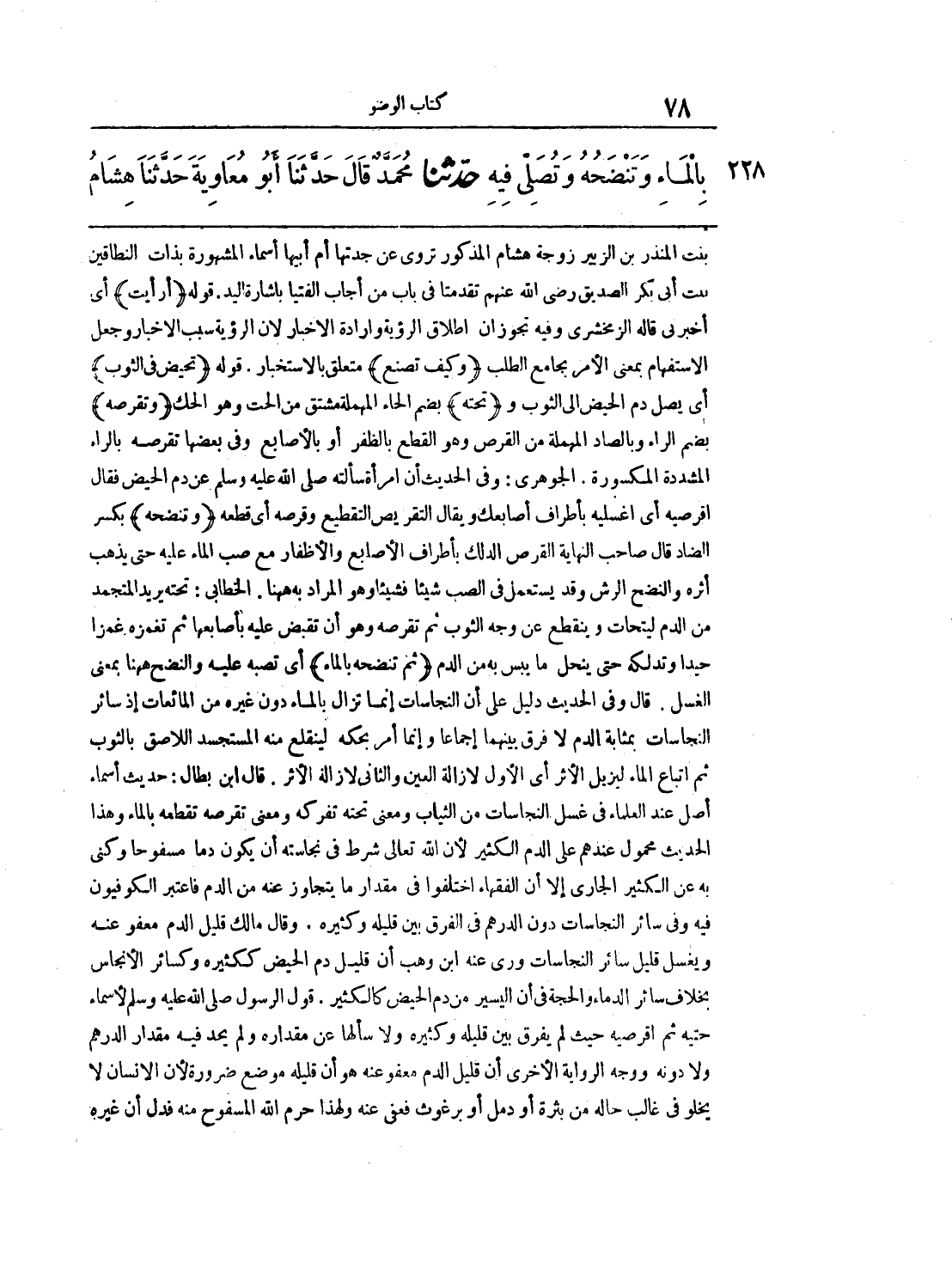 بنت المنذر بن الزبير زوجة هشام المذكور تروي عن جدتها أم أبيها أسماء المشهورة بذات النطاقين بنت أبي بكر الصديق رضي الله عنهم تقدمتا في باب من أجاب الفتيا بإشارة اليد. قوله (أرأيت) أي أخبرني قاله الزمخشري وفيه تجوزان إطلاق الرؤية وإرادة الإخبار لأن الرؤية سبب الإخبار وجعل الاستفهام بمعنى الأمر بجامع الطلب (وكيف تصنع) متعلق بالاستخبار. قوله (تحيض في الثوب) أي يصل دم الحيض إلى الثوب و (تحته) بضم الحاء المهملة مشتق من الحت وهو الحك (وتقرصه) بضم الراء وبالصاد المهملة من القرص وهو القطع بالظفر أو بالأصابع وفي بعضها تقرصه بالراء المشددة المكسورة. الجوهري: وفي الحديث أن امرأة سألته صلى الله عليه وسلم عن دم الحيض فقال اقرصيه أي اغسليه بأطراف أصابعك يقال التقريص التقطيع وقرصه أي قطعه (وتنضحه) بكسر الضاد قال صاحب النهاية القرص الدلك بأطراف الأصابع والأظفار مع صب الماء عليه حتى يذهب أثره والنضح الرش وقد يستعمل في الصب شيئا فشيئا وهو المراد به ههنا. الخطابى: تحته يريد المتجمد من الدم ليتحات وينقطع عن وجه الثوب ثم تقرصه وهو أن تقبض عليه بأصابعها ثم تغمزه غمزا جيدا وتدلكه حتى ينحل ما يبس به من الدم (ثم تنضحه بالماء) أي تصبه عليه والنضح ههنا بمعنى الغسل. قال وفي الحديث دليل على أن النجاسات إنما تزال بالماء دون غيره من المائعات إذ سائر النجاسات بمثابة الدم لا فرق بينهما إجماعا وإنما أمر بحكه لينقلع منه المستجسد اللاصق الثوب ثم إتباع الماء ليزيل الأثر أي الأول لإزالة العين والثاني لإزالة الأثر. قال ابن بطال: حديث أسماء أصل عند العلماء في غسل النجاسات من الثياب ومعنى تحته تفركه ومعنى تقرصه تقطعه بالماء وهذا الحديث محمول عندهم على الدم الكثير لأن الله تعالى شرط في نجاسته أن يكون دما مسفوحا وكني به عن الكثير الجاري إلا أن الفقهاء اختلفوا في مقدار ما يتجاوز عنه من الدم فاعتبر الكوفيون فيه وفي سائر النجاسات دون الدرهم في الفرق بين قليله وكثبره. وقال مالك قليل الدم معفو عنه ويغسل قليل سائر النجاسات ورى عنه ابن وهب أن قليل دم الحيض ككثيره وكسائر الأنجاس بخلاف سائر الدماء والحجة في أن اليسير من دم الحيض كالكثير. قول الرسول صلى الله عليه وسلم لأسماء حتيه ثم اقرصيه حيث لم يفرق بين قليله وكثيره ولا سألها عن مقداره ولم يحد فيه مقدار الدرهم ولا دونه ووجه الرواية الأخرى أن قليل الدم معفو عنه هو أن قليله موضع ضرورة لان الإنسان لا يخلو في غالب حاله من بثرة أو دمل أو برغوث فعفي عنه ولهذا حرم الله المسفوح منه فدل أن غيره