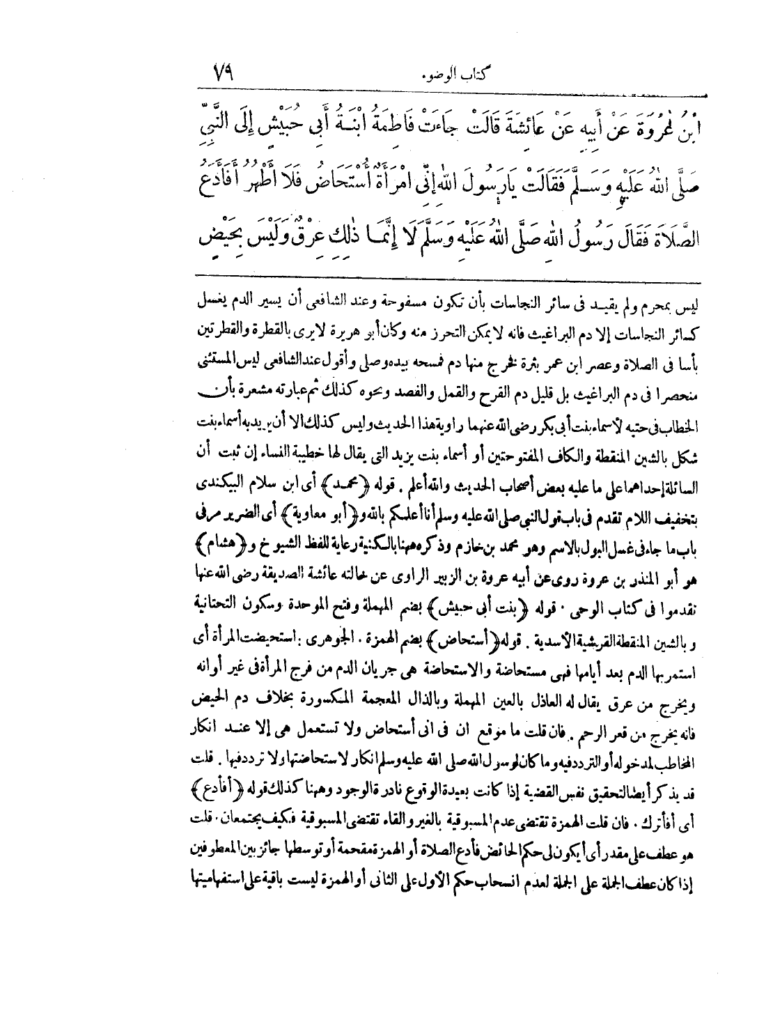 ليس بمحرم ولم يقيد في سائر النجاسات بأن تكون مسفوحة وعند الشافعي أن يسير الدم يغسل كسائر النجاسات إلا دم البراغيث فإنه لا يمكن التحرز منه وكان أبو هريرة لا يرى بالقطرة والقطرتين بأسا في الصلاة وعصر ابن عمر بثرة فخرج منها دم فمسحه بيده وصلى أقول عند الشافعي ليس المستثنى منحصرا في دم البراغيث بل قليل دم القرح والقمل والفصد ونحوه كذلك ثم عبارته مشعرة بان الخطاب في حتيه لأسماء بنت أبي بكر رضي الله عنهما رواية هذا الحديث وليس كذلك إلا أن يريد به أسماء بنت شكل بالشين المنقطة والكاف المفتوحتين أو أسماء بنت يزيد التي يقال لها خطيبة النساء إن ثبت أن السائلة إحداهما على ما عليه بعض أصحاب الحديث والله اعلم. قوله (محمد) أي ابن سلام البيكندي بتخفيف اللام تقدم في باب قول النبي صلى الله عليه وسلم انا اعلمكم بالله و (أبو معاوية) أي الضرير مر في باب ما جاء في غسل البول بالاسم وهو محمد بن خازم وذكره ههنا بالكنية رعاية للفظ الشيوخ و (هشام) هو أبو المنذر بن عروة روى عن أبيه عروة بن الزبير الراوي عن خالته عائشة الصديقة رضي الله عنها تقدموا في كتاب الوحي. قوله (بنت أبي حييش) بضم المهملة وفتح الموحدة وسكون التحتانية وبالشين المنقطة القرشية الأسدية. قوله (أستحاض) بضم الهمزة. الجوهري: استحيضت المرأة أي استمر بها الدم بعد أيامها فهي مستحاضة والاستحاضة هي جريان الدم من فرج المرأة في غير أواته ويخرج من عرق يقال له العاذل بالعين المهملة وبالذال المعجمة المكسورة بخلاف دم الحيض فإنه يخرج من قعر الرحم. فإن قلت ما موقع أن في أنى أستحاض ولا تستعمل هي إلا عند إنكار المخاطب لمدخوله أو التردد فيه وما كان لرسول الله صلى الله عليه وسلم إنكار لاستحاضتها ولا تردد فيها. قلت قد يذكر أيضا لتحقيق نفس القضية إذا كانت بعيدة الوقوع نادرة الوجود وههنا كذلك قوله (أفأدع) أي أفأترك. فإن قلت الهمزة تقتضي عدم المسبوقية بالغير والقاء تقتضي المسبوقية فكيف يجتمعان. قلت هو عطف على مقدر أي أيكون لي حكم الحائض فأدع الصلاة أو الهمزة مقحمة أو توسطها جائز بين المعطوفين إذا كان عطف الجملة على الجملة لعدم انسحاب حكم الأول على الثاني أو الهمزة ليست باقية على استفهاميتها