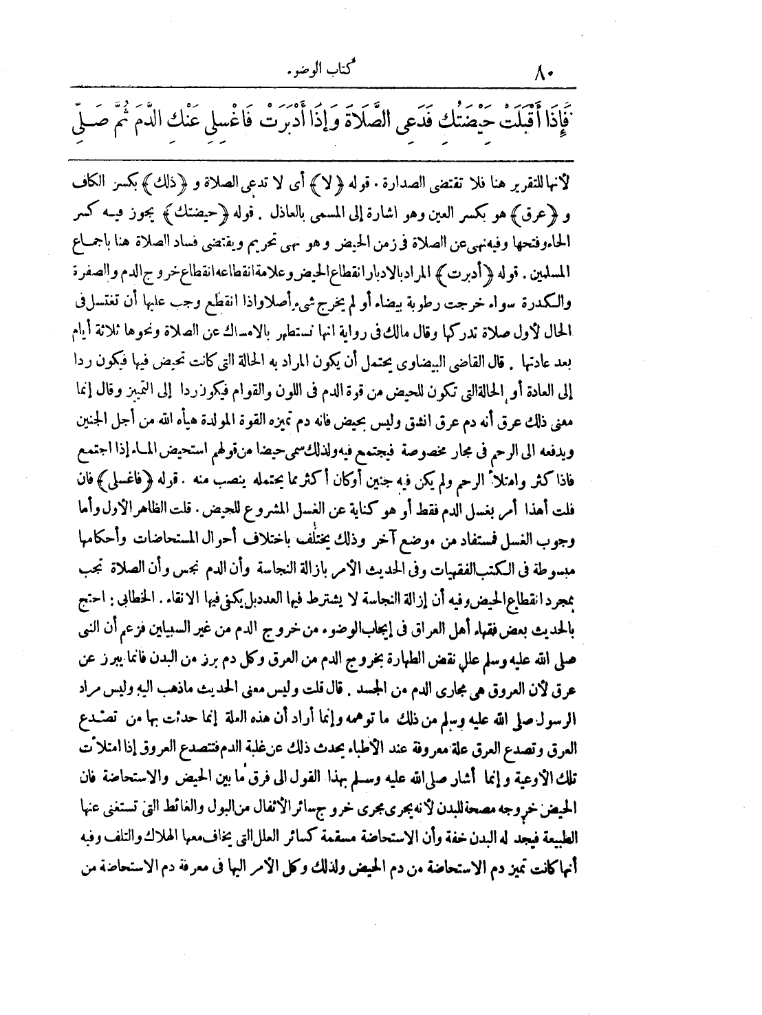 لأنها للتقرير هنا فلا تقتضي الصدارة. قوله (لا) أي لا تدعي الصلاة و (ذلك) بكسر الكاف و (عرق) هو بكسر العين هو إشارة إلى المسمى بالعاذل. قوله (حيضتك) يجوز فيه كسر الحاء وفتحها وفيه نهي عن الصلاة في زمن الحيض وهو نهي تحريم ويقتضي فساد الصلاة هنا بإجماع المسلمين. قوله (أدبرت) المراد بالإدبار انقطاع دم الحيض وعلامة انقطاعه انقطاع خروج الدم والصفرة والكدرة سواء خرجت رطوبة بيضاء أو لم يخرج شيء أصلا وإذا انقطع وجب عليها أن تغتسل في الحال لأول صلاة تدركها وقال مالك في رواية أنها تستطهر بالإمساك عن الصلاة ونحوها ثلاثة أيام بعد عادتها. قال القاضي البيضاوي يحتمل أن يكون المراد به الحالة التي كانت تحيض فيها فيكون ردا إلى العادة أو الحالة التي تكون للحيض من قوة الدم في اللون والقوام فيكون ردا إلى التمييز وقال إنما معنى ذلك عرق أنه دم عرق انشق وليس بحيض فإنه دم تميزه القوة المولدة هيأه الله من أجل الجنين ويدفعه إلى الرحم في بحار مخصوصة فيجتمع فيه ولذلك سمي حيضا من قولهم استحيض الماء إذا اجتمع فإذا كثر وامتلأ الرحم ولم يكن فيه جنين أو كان أكثر مما يحتمله ينصب منه. قوله (فاغسلي) فان قلت أهذا أمر بغسل الدم فقط أو هو كناية عن الغسل المشروع للحيض. قلت الظاهر الأول وأما وجوب الغسل فمستفاد من موضع أخر وذلك يختلف باختلاف أحوال المستحاضات وأحكامها مبسوطة في الكتب الفقهيات وفي الحديث الأمر بإزالة النجاسة وأن الدم نجس وأن الصلاة تجب بمجرد انقضاء الحيض وفيه أن إزالة النجاسة لا يشترط فيها العدد يكفي فيها الإنقاء. الخطابي: احتج بالحديث بعض فقهاء أهل العراق في إيجاب الوضوء من خروج الدم من غير السبيلين فزعم أن النبي صلى الله عليه وسلم علل نقص الطهارة بخروج الدم من العرق وكل دم برز من البدن فإنما يبرز عن عرق لان العروق هي مجاري الدم من الجسد. قال قلت وليس معنى الحديث ما ذهب إليه وليس مراد الرسول صلى الله عليه وسلم من ذلك ما توهمه وإنما أراد أن هذه العلة إنما حدثت بها من تصدع العرق وتصدع العرق علة معروفة عند الأطباء يحدث ذلك عن غلبة الدم فتتصدع العروق إذا امتلأت تلك الأوعية وإنما أشار صلى الله عليه وسلم بهذا القول إلى فرق مابين الحيض والاستحاضة فإن الحيض خروجه مصحة للبدن لأنه يجري مجرى خروج سائر الأثقال من البول والغائط التي تستغني عنها الطبيعة فيجد له البدن خفة وأن الاستحاضة مسقمة كسائر العلل التي يخاف معها الهلاك والتلف وفيه أنها كانت تميز دم الاستحاضة من