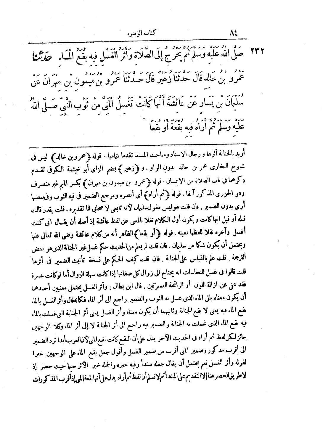232 - حَدَّثَنَا عَمْرُو بْنُ خَالِدٍ قَالَ حَدَّثَنَا زُهَيْرٌ قَالَ حَدَّثَنَا عَمْرُو بْنُ مَيْمُونِ بْنِ مِهْرَانَ عَنْ سُلَيْمَانَ بْنِ يَسَارٍ عَنْ عَائِشَةَ أَنَّهَا كَانَتْ تَغْسِلُ الْمَنِىَّ مِنْ ثَوْبِ النَّبِىِّ صَلَّى الله عليه وسلّم، ثُمَّ أَرَاهُ فِيهِ بُقْعَةً أَوْ بُقَعاً