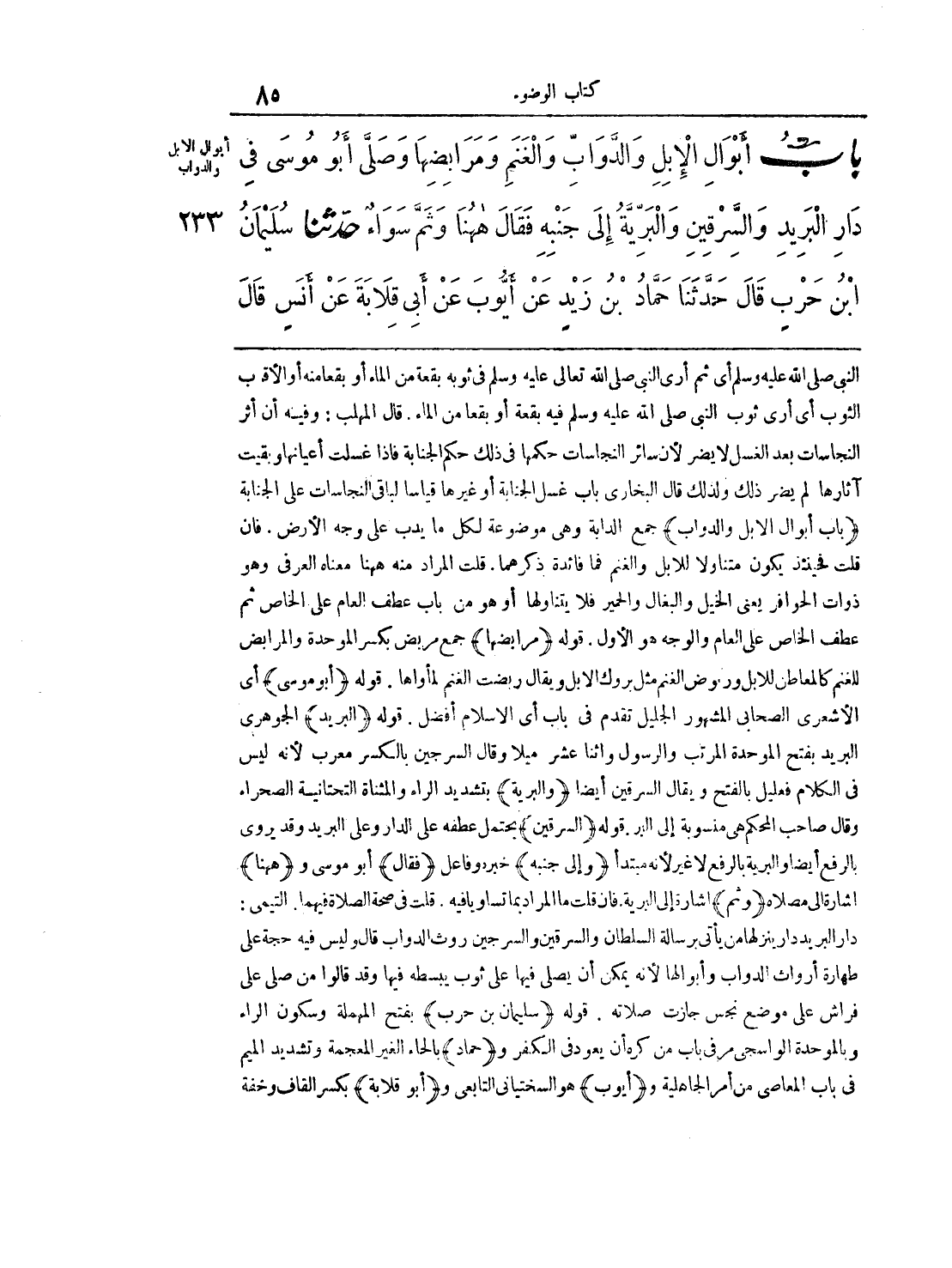 النبي صلى الله عليه وسلم أي ثم أرى النبي صلى الله تعالى عليه وسلم في ثوبه بقعة من الماء أو بقعا منه أو الأقرب الثوب أي أرى ثوب النبي صلى الله عليه وسلم فيه بقعة أو بقعا من الماء. قال المهلب: وفيه أن أثر النجاسات بعد الغسل لا يضر لأن سائر النجاسات حكمها في ذلك حكم الجنابة فإذا غسلت أعيانها وبقيت آثارها لم يضر ذلك ولذلك قال البخاري باب غسل الجنابة أو غيرها قياسا لباقي النجاسات على الجنابة (باب أبوال الإبل والدواب) جمع الدابة وهي موضوعة لكل ما يدب على وجه الأرض. فإن قلت فحينئذ يكون متناولا للإبل والغنم فما فائدة ذكرهما. قلت المراد منه ههنا معناه العرفي وهو ذوات الحوافر يعني الخيل والبغال والحمير فلا يتناولها أو هو من باب عطف العام على الخاص ثم عطف الخاص على العام والوجه هو الأول. قوله (مرابضها) جمع مربض بكسر الموحدة والمرابض للغنم كالمعاطن للإبل وربوض الغنم مثل بروك الإبل ويقال ربضت الغنم لمأواها. قوله (أبو موسى) أي الأشعري الصحابي المشهور الجليل تقدم في باب أي الإسلام أفضل. قوله (البريد) الجوهري البريد يفتح الموحدة المرتب والرسول واثنا عشر ميلا وقال السرجين بالكسر معرب لأنه ليس في الكلام فعليل بالفتح ويقال السرقين أيضا (والبرية) بتشديد الراء والمثناة التحتانية الصحراء وقال صاحب المحكم هي منسوبة إلى البر. قوله (السرقين) يحتمل عطفه على الدار وعلى البريد وقد يروى بالرفع أيضا والبرية بالرفع لا غير لأنه مبتدأ (والى جنبه) خبره وفاعل (فقال) أبو موسى و (ههنا) إشارة إلى مصلاه (وثم) إشارة إلى البرية فإن قلت ما المراد بما تساويا فيه. قلت في صحة الصلاة فيهما. التيمي: دار البريد دار ينزلها من يأتي برسالة السلطان والسرقين والسرجين روث الدواب قال وليس فيه حجة على طهارة أرواث الدواب وأبوالها لأنه يمكن أن يصلي فيها على ثوب يبسطه فيها وقد قالوا من صلى على فراش على موضع نجس جازت صلاته. قوله (سليمان ابن حرب) بفتح المهملة وسكون الراء وبالموحدة الواسجي مر في باب من كره أن يعود في الكفر و (حماد) بالحاء غير المعجمة وتشديد الميم في باب المعاصي من أمر الجاهلية و (أيوب) هو السختياني التابعي و (أبو قلابة) بكسر القاف وخفة