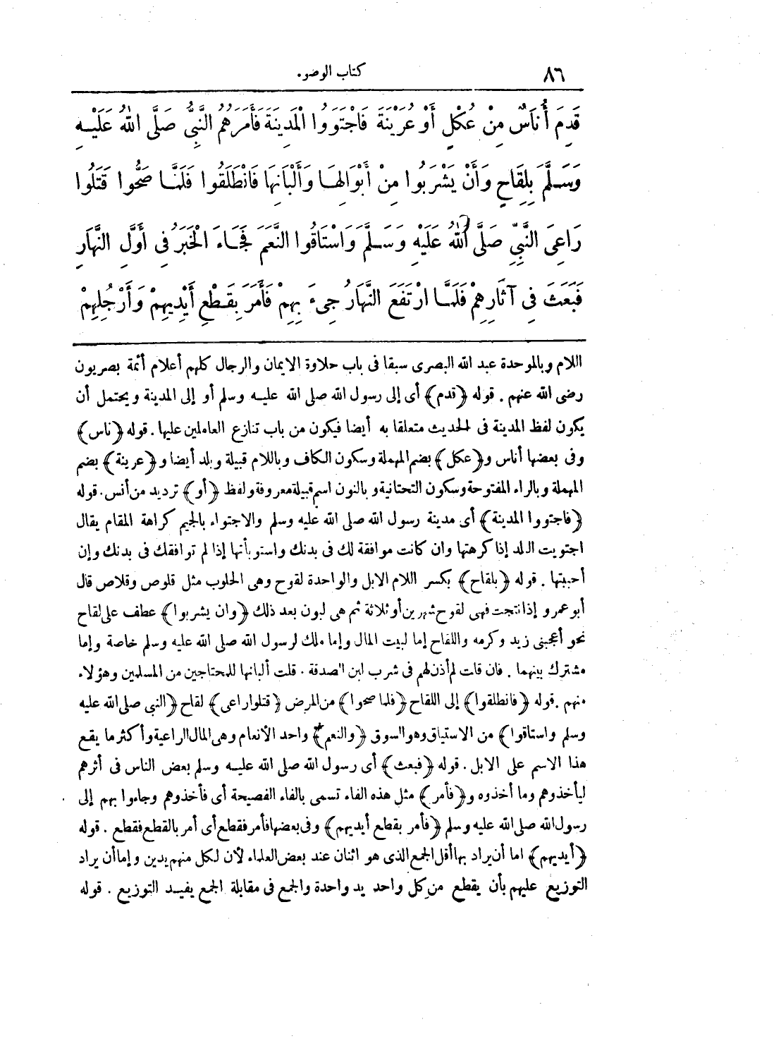 قَدِمَ أُنَاسٌ مِنْ عُكْلٍ أَوْ عُرَيْنَةَ، فَاجْتَوَوُا الْمَدِينَةَ، فَأَمَرَهُمْ النَّبِىُّ صلى الله عليه وسلم بِلِقَاحٍ، وَأَنْ يَشْرَبُوا مِنْ أَبْوَالِهَا وَأَلْبَانِهَا، فَانْطَلَقُوا، فَلَمَّا صَحُّوا قَتَلُوا رَاعِىَ النَّبِىِّ صَلَّى الله عليه وسلّم وَاسْتَاقُوا النَّعَمَ، فَجَاءَ الْخَبَرُ فِى أَوَّلِ النَّهَارِ، فَبَعَثَ فِى آثَارِهِمْ، فَلَمَّا ارْتَفَعَ النَّهَارُ جِىءَ بِهِمْ، فَأَمَرَ فَقَطَعَ أَيْدِيَهُمْ وَأَرْجُلَهُمْ
