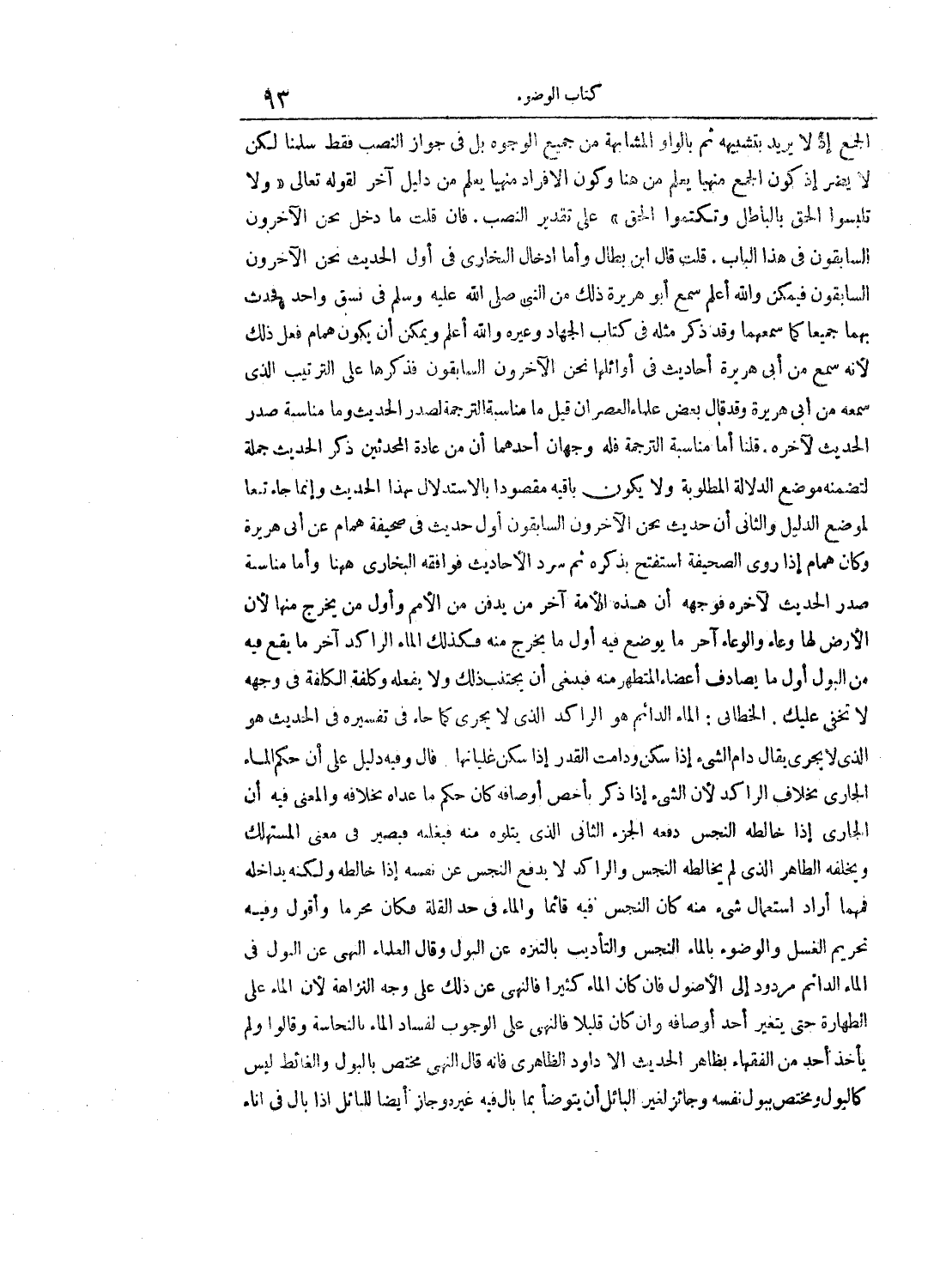 الجمع إذ لا يريد بتشبيهه ثم بالواو المشابهة من جميع الوجوه بل في جواز النصب فقط سلمنا لكن لا يضر إذ كون الجمع منهيا يعلم من هنا وكون الإفراد منهيا يعلم من دليل أخر لقوله تعالى «ولا تلبسوا الحق بالباطل وتكتموا الحق» عل تقدير النصب. فان قلت ما دخل نحن الآخرون السابقون في هذا الباب. قلت قال ابن بطال وأما إدخال البخاري في أول الحديث نحن الآخرون السابقون فيمكن والله أعلم سمع أبو هريرة ذلك من النبي صل الله عليه وسلم في نسق واحد فحدث بهما جميعا كما سمعهما وقد ذكر مثله في كتاب الجهاد وعيره والله اعلم ويمكن أن يكون همام فعل ذلك لأنه سمع من أبي هريرة أحاديث في أوائلها نحن الآخرون السابقون فذكرها على الترتيب الذي سمعه من أبي هريرة وقد قال بعض علماء العصر إن قيل ما مناسبة الترجمة لصدر الحديث وما مناسبة صدر الحديث لآخره. قلنا أما مناسبة الترجمة فله وجهان أحدهما أن من عادة المحدثين ذكر الحديث جملة لتضمنه موضع الدلالة المطلوبة ولا يكون باقية مقصودا بالاستدلال بهذا الحديث وإنما جاء تبعا لموضع الدليل والثاني أن حديث نحن الآخرون السابقون أول حديث في صحيفة همام عن أبي هريرة وكان همام إذا روى الصحيفة استفتح بذكره ثم سرد الأحاديث فوافقه البخاري ههنا وأما مناسبة صدر الحديث لآخره فوجهه أن هذه الأمة آخر من يدفن من الأمم وأول من يخرج منها لان الأرض لها وعاء والوعاء آخر ما يوضع فيه أول ما يخرج منه فكذلك الماء الراكد أخر ما يقع فيه من البول أول ما يصادف أعضاء المتطهر منه فينبغي أن يجتنب ذلك ولا يفعله وكلفة الكلفة في وجهه لا تخفى عليك. الخطابى: الماء الدائم هو الراكد الذي لا يجري كما جاء في تفسيره في الحديث هو الذي لا يجري يقال دام الشيء إذا سكن ودامت القدر إذا سكن غليانها قال وفيه دليل على آن حكم الماء الجاري بخلاف الراكد لان الشيء إذا ذكر بأخص أوصافه كان حكم ما عداه بخلافه والمعنى فيه أن الجاري إذا خالطه النجس دفعه الجزء الثاني الذي يتلوه منه فيغلبه فيصير في معنى المستهلك ويخلفه الطاهر الذي لم يخالطه النجس والراكد لا يدفع النجس عن نفسه إذا خالطه ولكنه يداخله فمهما أراد استعمال شيء منه كان النجس فيه قائما والماء في حد القلة فكان محرما وأقول وفيه تحريم الغسل والوضوء بالماء النجس والتأديب بالتنزه عن البول وقال العلماء النهي عن البول في الماء الدائم مردود إلى الأصول فان كان الماء كثيرا فالنهي عن ذلك على وجه النزاهة لأن الماء على الطهارة حتى يتغير أحد أوصافه وان كان قليلا فالنهي على الوجوب لفساد الماء بالنجاسة وقالوا ولم يأخذ احد من الفقهاء بظاهر الحديث إلا داود الظاهري فإنه قال النهي مختص بالبول والغائط ليس كالبول ومختص ببول نفسه وجائز لغير البائل أن يتوضأ بما بال فيه غيره وجاز أيضا للبائل إذا بال في إناء