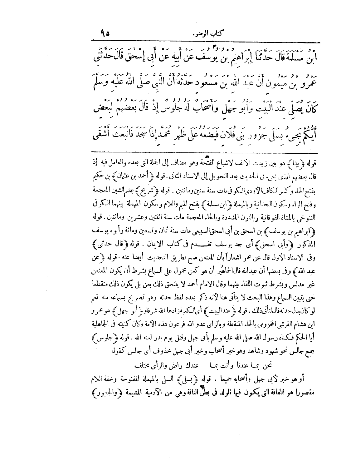 قوله (بينا) هو بين زيدت الألف لإشباع الفتحة وهو مضاف إلى الجملة التي بعده والعامل فيه إذا قال بعضهم الذي يجيء في الحديث بعد التحويل إلى الإسناد الثاني. قوله (أحمد بن عثمان) بن حكيم بفتح الحاء وكسر الكاف الأودي الكوفي مات سنة ستين ومائتين. قوله (شريح) بضم الشين المعجمة وفتح الراء وسكون التحتانية وبالمهملة (ابن مسلمة) بفتح الميم واللام وسكون المهملة بينهما الكوفي التنوخي بالمثناة الفوقانية وبالنون المشددة وبالحاء المعجمة مات سنة اثنتين وعشرين ومائتين. قوله (إبراهيم ابن يوسف) بن إسحاق بن أبي إسحاق السبيعي مات سنة ثمان وتسعين ومائة. وأبوه يوسف المذكور (وأبي إسحاق) أي جد يوسف تقدم في كتاب الإيمان. قوله (قال حدثني) وفي الإسناد الأول قال عن عمر إشعارا بأن المعنعن صح بطريق التحديث أيضا عنه. قوله (عن عبد الله) وفي بعضها أن عبد الله قال الجماهير أن هو كعن محمول على السماع بشرط أن يكون المعنعن غير مدلس وبشرط ثبوت اللقاء بينهما وقال الإمام أحمد لا يلتحق ذلك بعن بل يكون ذلك منقطعا حتى يتبين السماع وهذا البحث لا يأتي هنا لأنه ذكر بعده لفظ حدثه وهو تصريح بسماعه منه نعم لو كان بدل حدثه قال لتأتي ذلك. (قوله عند البيت) أي الكعبة زادها الله شرفا و (أبو جهل) هو عمر ابن هشام القرشي المخزومي بالخاء المنقطعة وبالزاي عدو الله فرعون هذه الأمة وكان كنيته في الجاهلية أبا الحكم فكناه رسول الله صلى الله عليه وسلم بأبي جهل وقتل يوم بدر لعنه الله. قوله (جلوس) جمع جالس نحو شهود وشاهد وهو خبر أصحاب وخبر أبي جهل محذوف أي جالس كقوله: