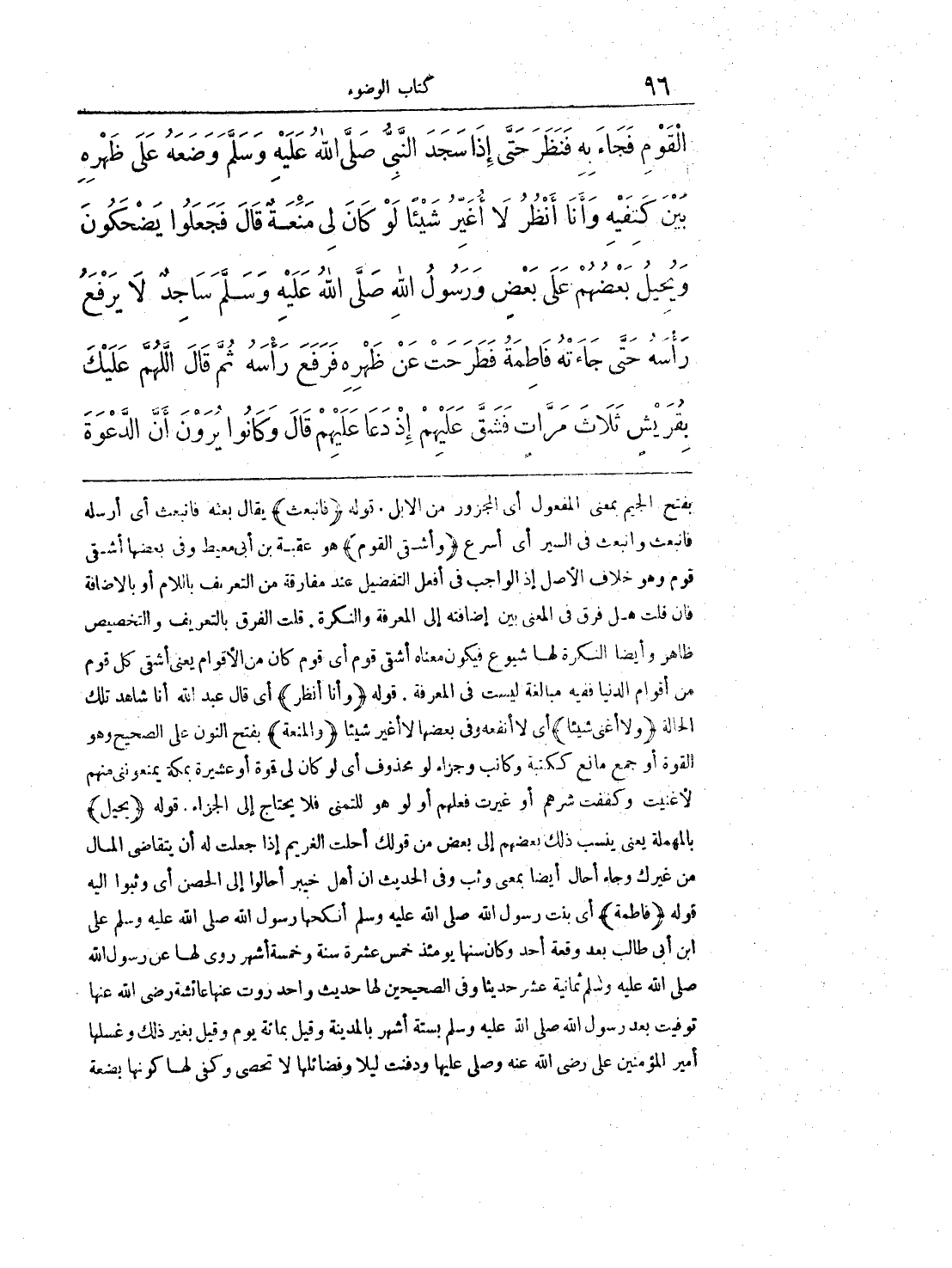 بفتح الجيم بمعنى المفعول أي المجزور من الإبل. قوله (فانبعث) يقال بعثه فانبعث أي أرسله وانبعث في السير أي أسرع (وأشقى القوم) هو عقبة ابن أبي معيط وفي بعضها أشقى قوم هو خلاف لأصل إذ الواجب عند افعل التفضيل عند مفارقة من التعريف باللام أو بالإضافة فان قلت هل فرق في المعنى بين إضافته إلى المعرفة والنكرة. قلت الفرق بالتعريف والتخصيص ظاهر وأيضا النكرة لها شيوع فيكون معناه أشقى قوم أي قوم كان من الأقوام يعني أشقى كل قوم من أقوام الدنيا ففيه مبالغة ليست في المعرفة. قوله (وأنا أنظر) أي قال عبد الله أنا شاهد تلك الحالة (ولا أغني شيئا) أي لا أنفعه وفي بعضها لا أغير شيئا (والمنعة) بفتح النون على الصحيح وهو القوة أو جمع مانع ككتبه وكاتب وجزاء لو محذوف أي لو كان لي قوة أو عشيرة بمكة يمنعونني منهم لأغنيت أو كففت شرهم أو غيرت فعلهم أو ولو هو للتمني فلا يحتاج إلى الجزاء. قوله (يحيل) بالمهملة يعني ينسب ذلك بعضهم إلى بعض من قولك أحلت الغريم إذا جعلت له أن يتقاضى المال من غيرك وجاء أحال أيضا بمعنى وثب وفي الحديث أن أهل خيبر أحالوا إلى الحصن أي وثبوا إليه قوله (فاطمة) أي بنت رسول الله صلى الله عليه وسلم أنكحها رسول الله صلى الله عليه وسلم على ابن أبي طالب بعد وقعة أحد وكان سنها يومئذ خمس عشرة سنة وخمسة أشهر روي لها عن رسول الله صلى الله عليه وسلم ثمانية عشر حديثا وفي الصحيحين لها حديث واحد روت عائشة رضي الله عنها توفيت بعد رسول الله صلى الله عليه وسلم بستة أشهر بالمدينة وقيل بمائة يوم وقيل بغير ذلك وغسلها أمير المؤمنين علي رضي الله عنه وصلى عليها ودفنت ليلا وفضائلها لا تحصى وكف لها كونها بضعة