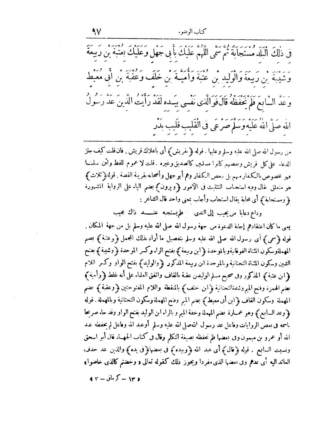 من رسول الله صلى الله عليه وسلم وعليها. قوله (بقريش) أي بهلاك قريش. فإن قلت كيف جاز الدعاء على كل قريش وبعضهم كانوا مسلمين كالصديق وغيره. قلت لا عموم للفظ ولئن سلمنا فهو مخصوص بالكفار منهم بل بعض الكفار وهم أبو جهل وأصحابه بقرينة القصة قوله (ثلاث) هو متعلق بقال وفيه استحباب التثليث في الأمور (ويرون) بضم الياء في الرواية المشهورة (ومستجابة) أي مجابة يقال استجاب وأجاب بمعنى واحد قال الشاعر: