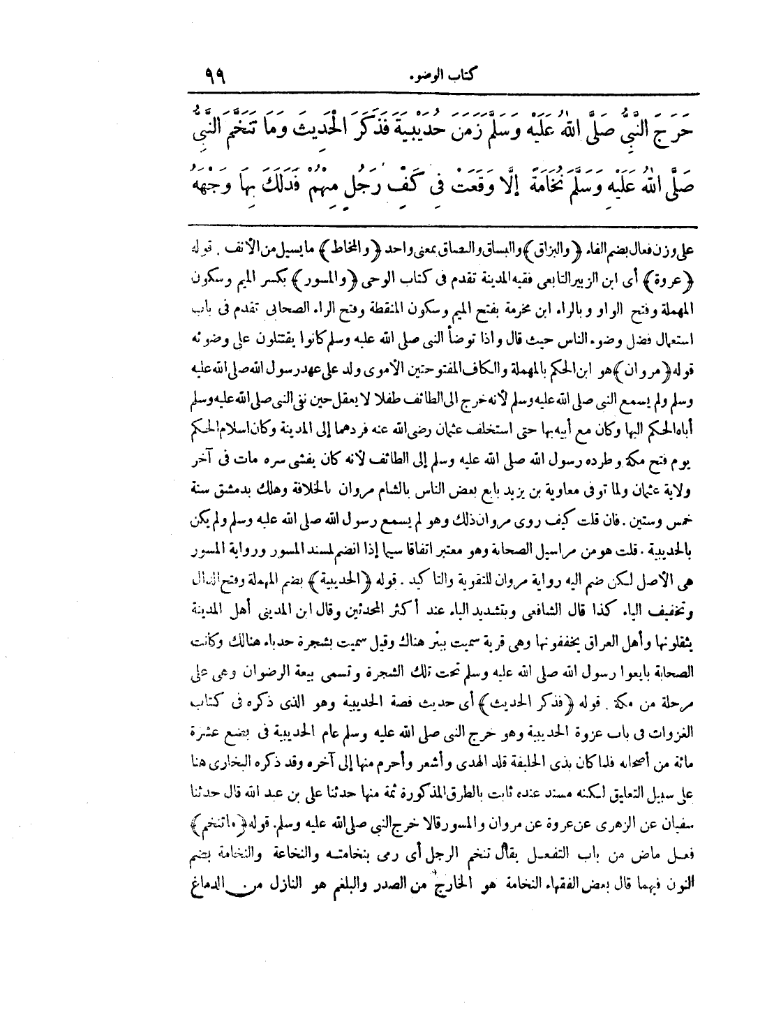 على وزن فعال بضم الفاء (والبزاق) والبساق والبصاق بمعنى واحد (والمخاط) ما يسيل من الأنف. قوله (عروة) أي ابن الزبير التابعي فقيه المدينة تقدم في كتاب الوحي (والمسور) بكسر الميم وسكون المهملة وفتح الواو وبالراء ابن مخرمة بفتح الميم وسكون المنقطة وفتح الراء الصحابي تقدم في باب استعمال فضل وضوء الناس حيث قال وإذا توضأ النبي صلى الله عليه وسلم كانوا يقتتلون على وضوئه قوله (مروان) هو ابن الحكم بالمهملة والكاف المفتوحتين الأموي ولد على عهد رسول الله صلى الله عليه وسلم ولم يسمع النبي صلى الله عليه وسلم لأنه خرج إلى الطائف طفلا لا يعقل حين نفي النبي صلى الله عليه وسلم أباه الحكم إليها وكان مع أبيه بها حتى استخلف عثمان رضي الله عنه فردهما إلى المدينة وكان إسلام الحكم يوم فتح مكة وطرده رسول الله صلى الله عليه وسلم إلى الطائف لأنه كان يفشي سره مات في أخر ولاية عثمان ولما توفي معاوية بن يزيد بايع بعض الناس بالشام مروان بالخلافة وهلك بدمشق سنة خمس وستين. فان قلت كيف روى مروان ذلك وهو لم يسمع رسول الله صلى الله عليه وسلم ولم يكن بالحديبية. قلت هو من مراسيل الصحابة وهو معتبر اتفاقا سيما إذا انضم لمسند المسور ورواية المسور هي الأصل لكن ضم إليه رواية مروان للتقوية والتأكيد. قوله (الحديبية) بضم المهملة وفتح الدال وتخفيف الياء كذا قال الشافعي وبتشديد الياء عند أكثر المحدثين وقال ابن المديني أهل المدينة يثقلونها وأهل العراق يخففونها وهي قرية سميت ببئر هناك وقيل سميت بشجرة حدباء هنالك وكانت الصحابة بايعوا رسول الله صلى الله عليه وسلم تحت تلك الشجرة وتسمى بيعة الرضوان وهي على مرحلة من مكة. قوله (فذكر الحديث) أي حديث قصة الحديبية وهو الذي ذكره في كتاب الغزوات في باب غزوة الحديبية وهو خرج النبي صلى الله عليه وسلم عام الحديبية في بضع عشرة مائة من أصحابه فلما كان بذي الحليفة قلد الهدى وأشعر وأحرم منها إلى أخره وقد ذكره البخاري هنا على سبيل التعليق لكنه مسند عنده ثابت بالطرق المذكورة ثمة منها حدثنا على عبد الله قال حدثنا سفيان عن الزهري عن عروة عن مروان والمسور قالا خرج النبي صلى الله عليه وسلم. قوله (ما تنخم) فعل ماض من باب التفعل يقال تنخم الرجل أي رمى بنخامته والنخاعة والنخامة بضم النون فيهما قال بعض الفقهاء هو الخارج من الصدر والبلغم وهو النازل من الدماغ