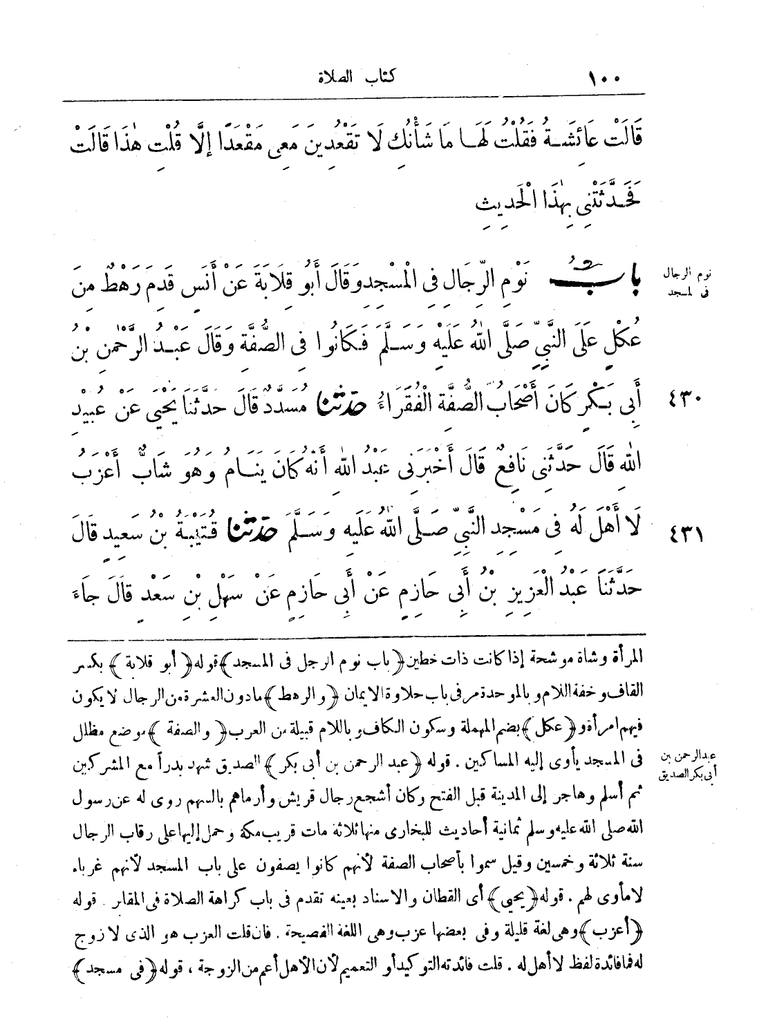 430 - حَدَّثَنَا مُسَدَّدٌ قَالَ حَدَّثَنَا يَحْيَى عَنْ عُبَيْدِ اللَّهِ قَالَ حَدَّثَنِى نَافِعٌ قَالَ أَخْبَرَنِى عَبْدُ اللَّهِ أَنَّهُ كَانَ يَنَامُ وَهْوَ شَابٌّ أَعْزَبُ لاَ أَهْلَ لَهُ فِى مَسْجِدِ النَّبِىِّ - صلى الله عليه وسلم -.